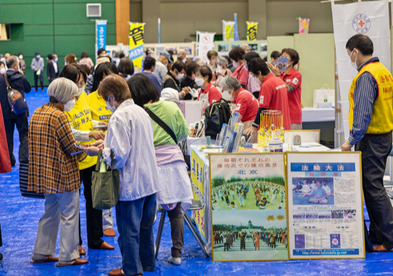 有一位看起来三十岁左右的年轻人,他看到展位上法轮功学员在随着音乐炼功,当场表示想学。于是法轮功学员就教了他第一、第二套功法的动作,之后法轮功学员还告诉了他平常义务教功的地方与时间,并将日文版的《转法轮》与教功DVD借给了他。他向法轮功学员表示感谢。