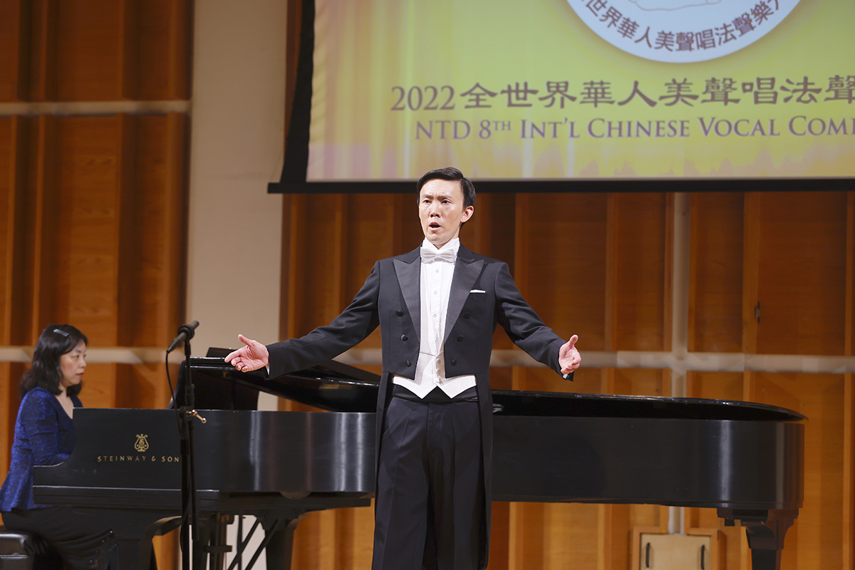 ![]() 图5:来自美国纽约的选手、男声组铜奖获得者之一,李新在演唱《大江东去》。(大纪元) |