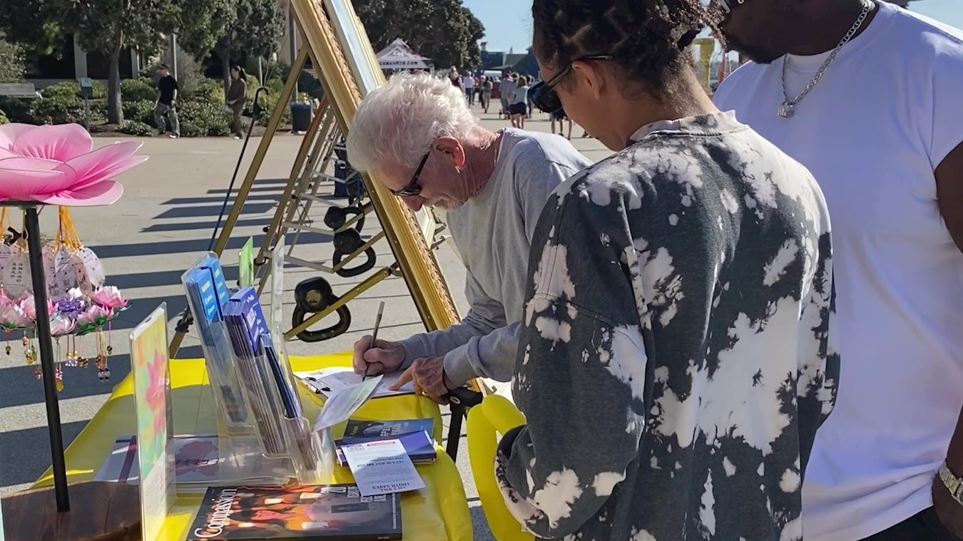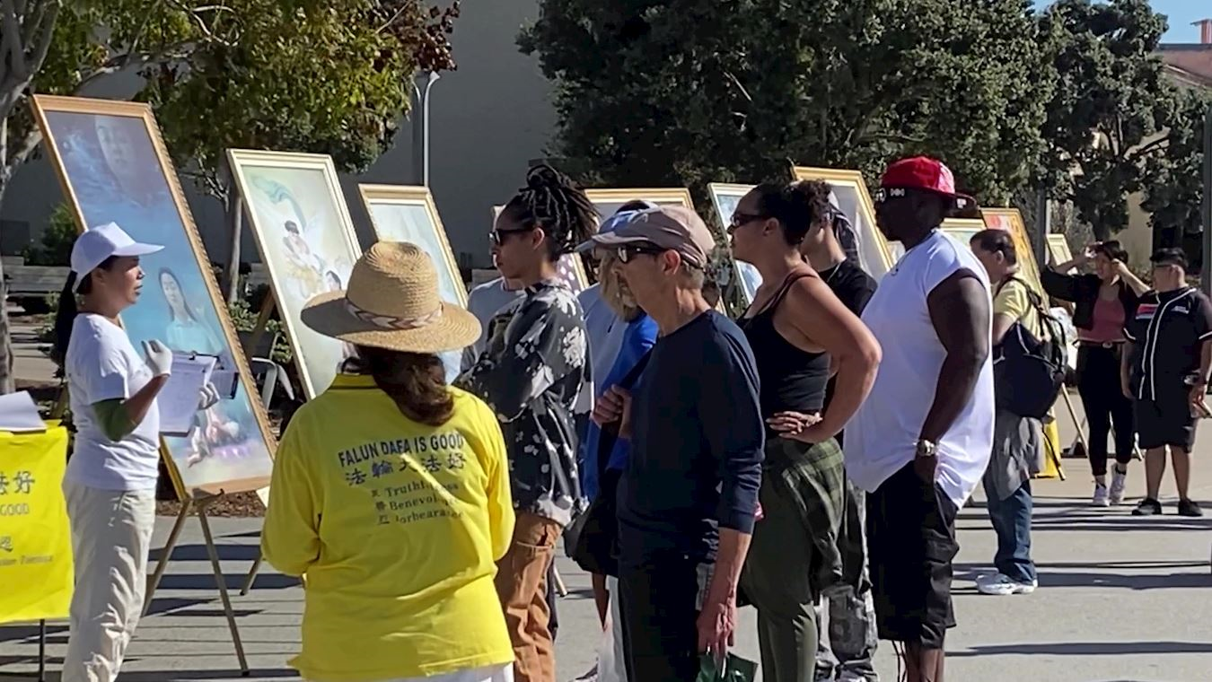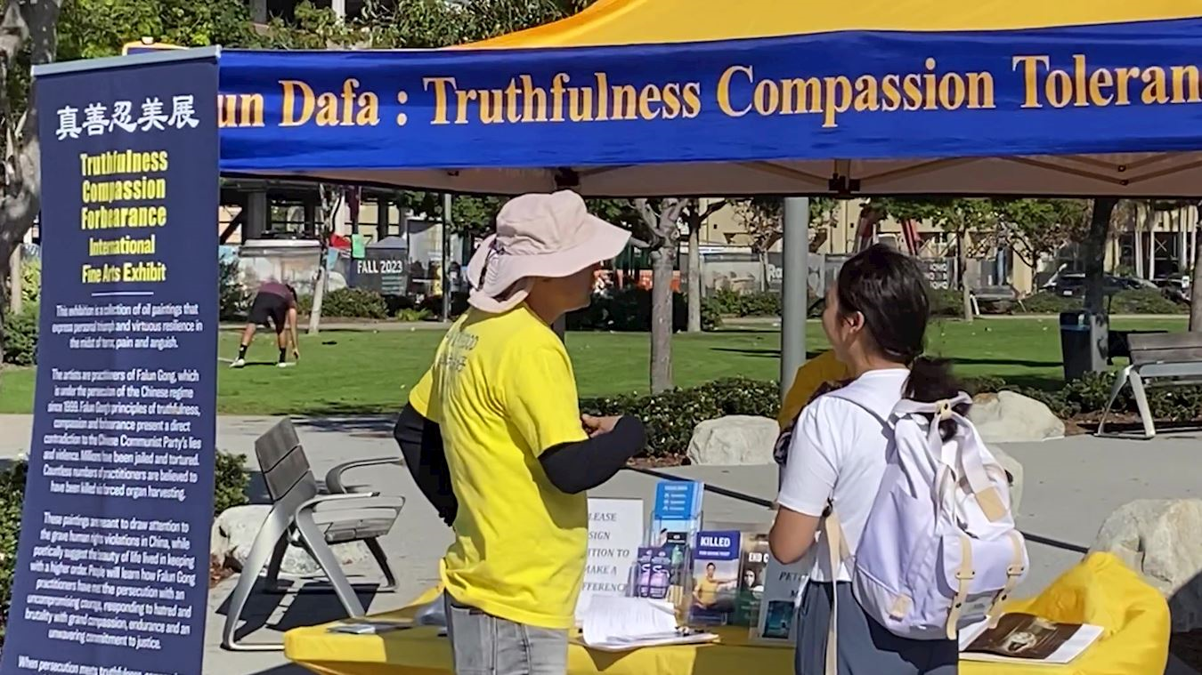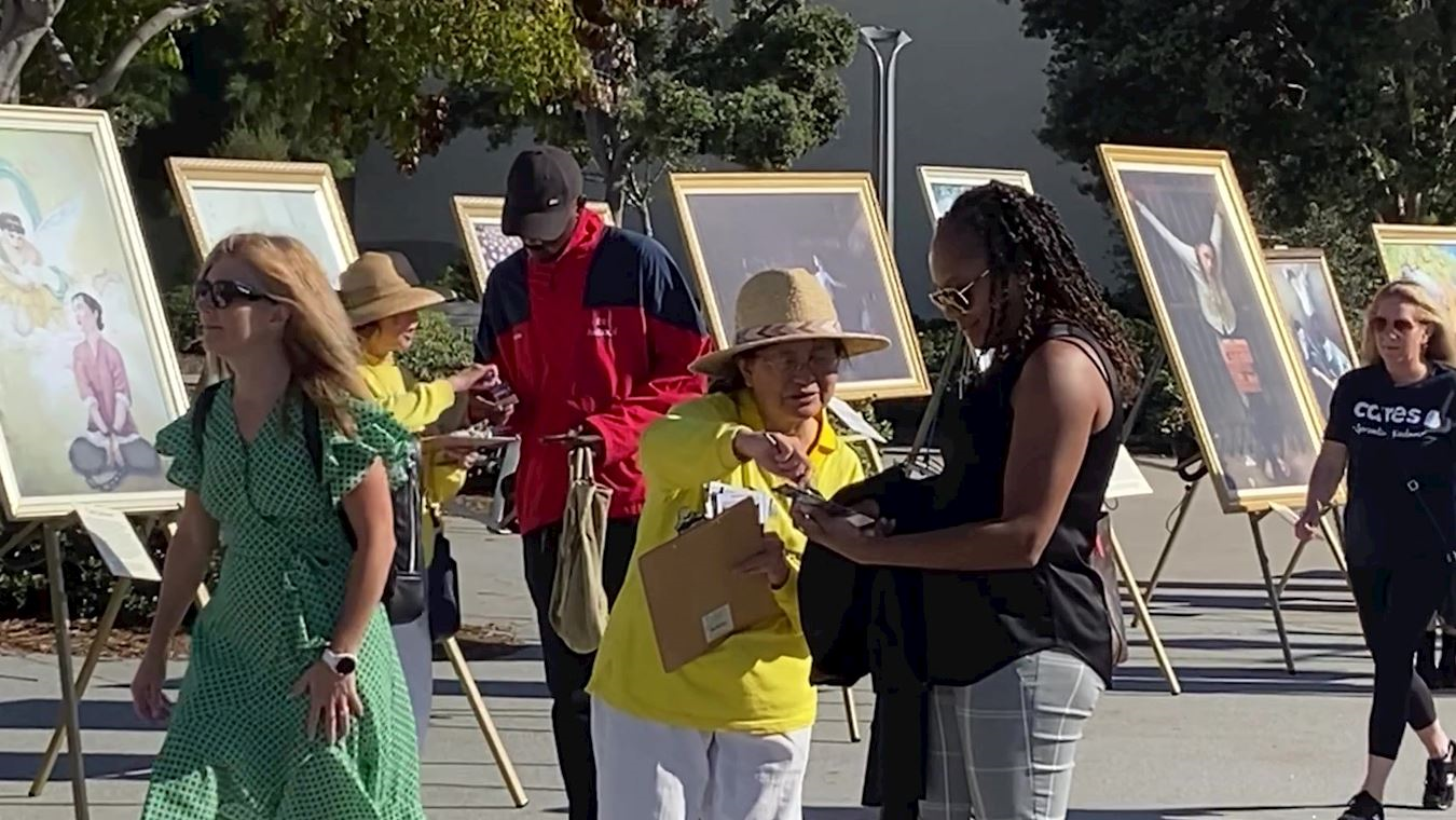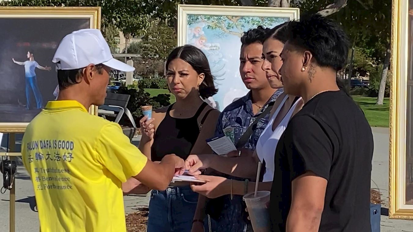 罗珊娜(Roxanna)是圣地亚哥的艺术家,她上班途中经过公园观看了真善忍画展很受触动,主动签名支持法轮功反迫害。当看到法轮功舒缓、祥和、优美的功法演示后,罗珊娜(Roxanna)问了学员们炼功的地点,还表示她第二天不上班,一定要去那儿学炼这五套功法。