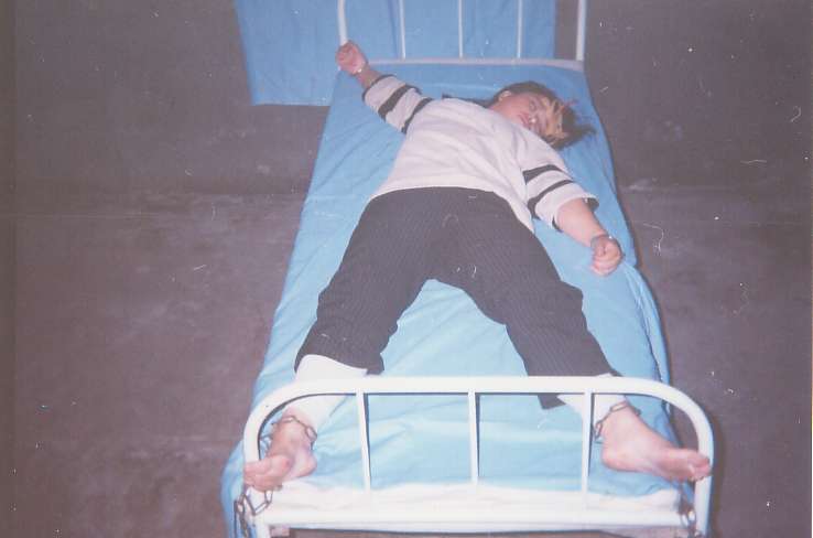 ◎李佩贤。二零一零年因向世人澄清法轮功真相被绑架入狱,被众犯人按在床上,四肢拉抻,用束缚带捆绑。犯人用手铐把她铐在床上整整三个月。她经常被几个犯人抬起来往地上摔,差点被摔死。李佩贤被迫害的肚子里长瘤,腹部肿大,双腿严重浮肿、骨瘦如柴,被用轮椅推着。