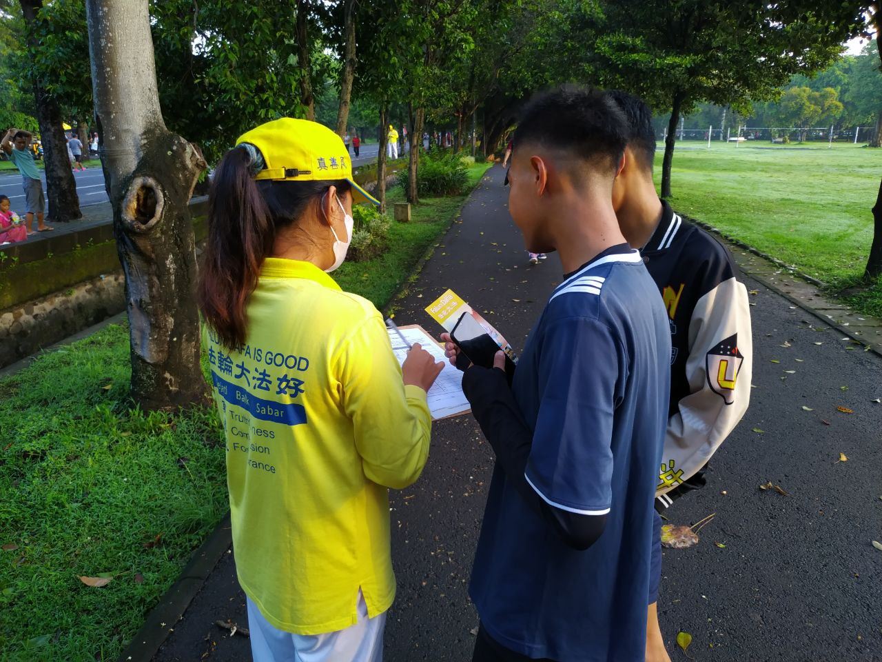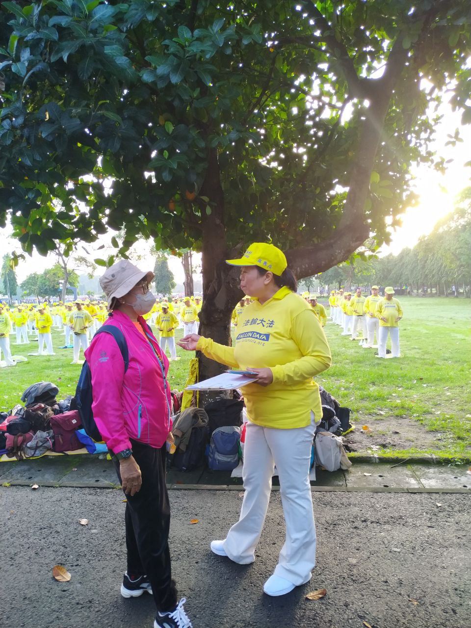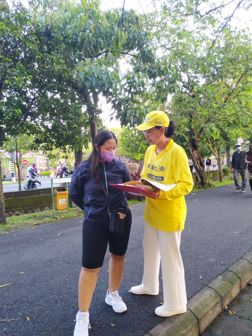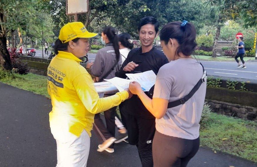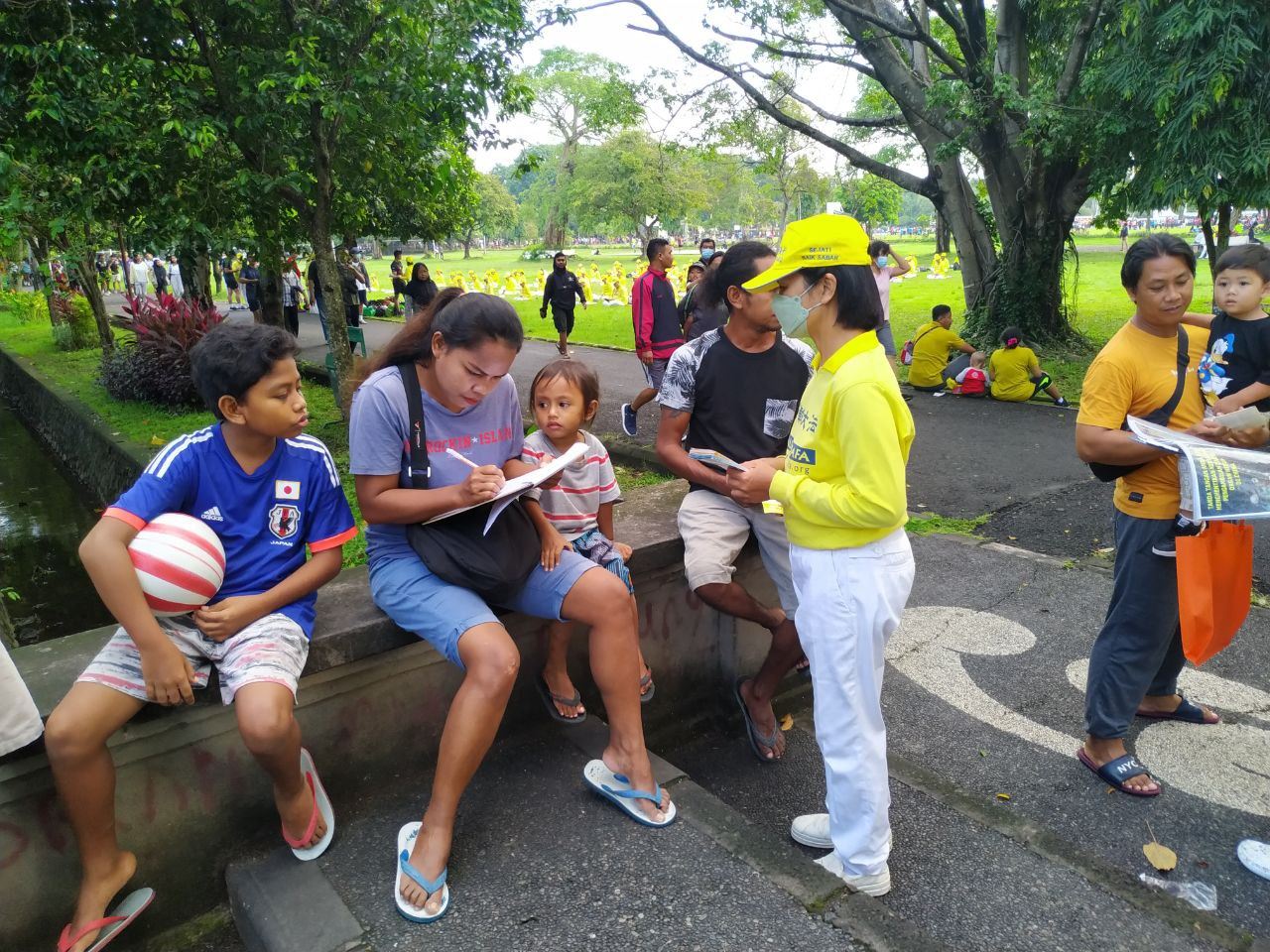 【明慧网二零二二年十一月三十日】二零二二年十一月二十七日周日早上,巴里岛登巴萨(Denpasar)市雷嫩(Renon)区尼第·曼达拉广场(Lapangan Niti Mandala)重新启动无车日(Car Free Day)活动。在众多市民晨练的广场,来自峇里岛各处的学员在该广场西边集体炼功,并且更广泛地向所有民众介绍法轮大法。