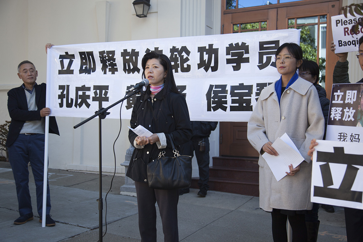 ![]() 图4:湾区居民刘芷彤在中共旧金山总领馆前,展示与母亲孔庆平的照片,要求中共当局立即释放自己的母亲。 |