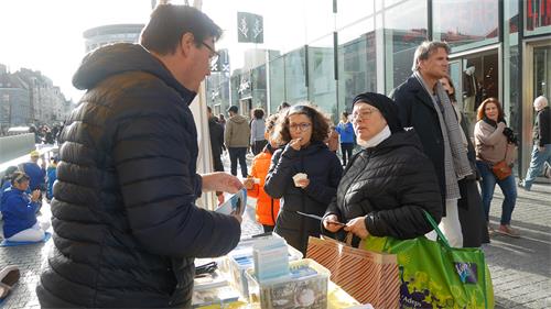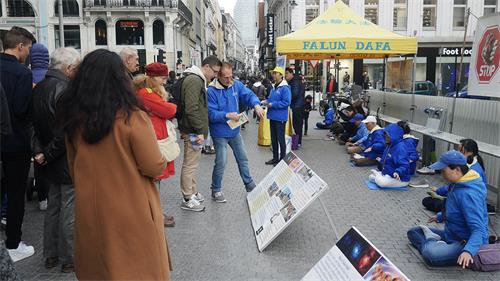 图1~5:秋假的最后一个周末,比利时法轮功学员在商业大街上弘法,并征集反迫害签名