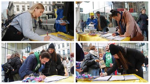 '图1~5:秋假的最后一个周末,比利时法轮功学员在商业大街上弘法,并征集反迫害签名'
