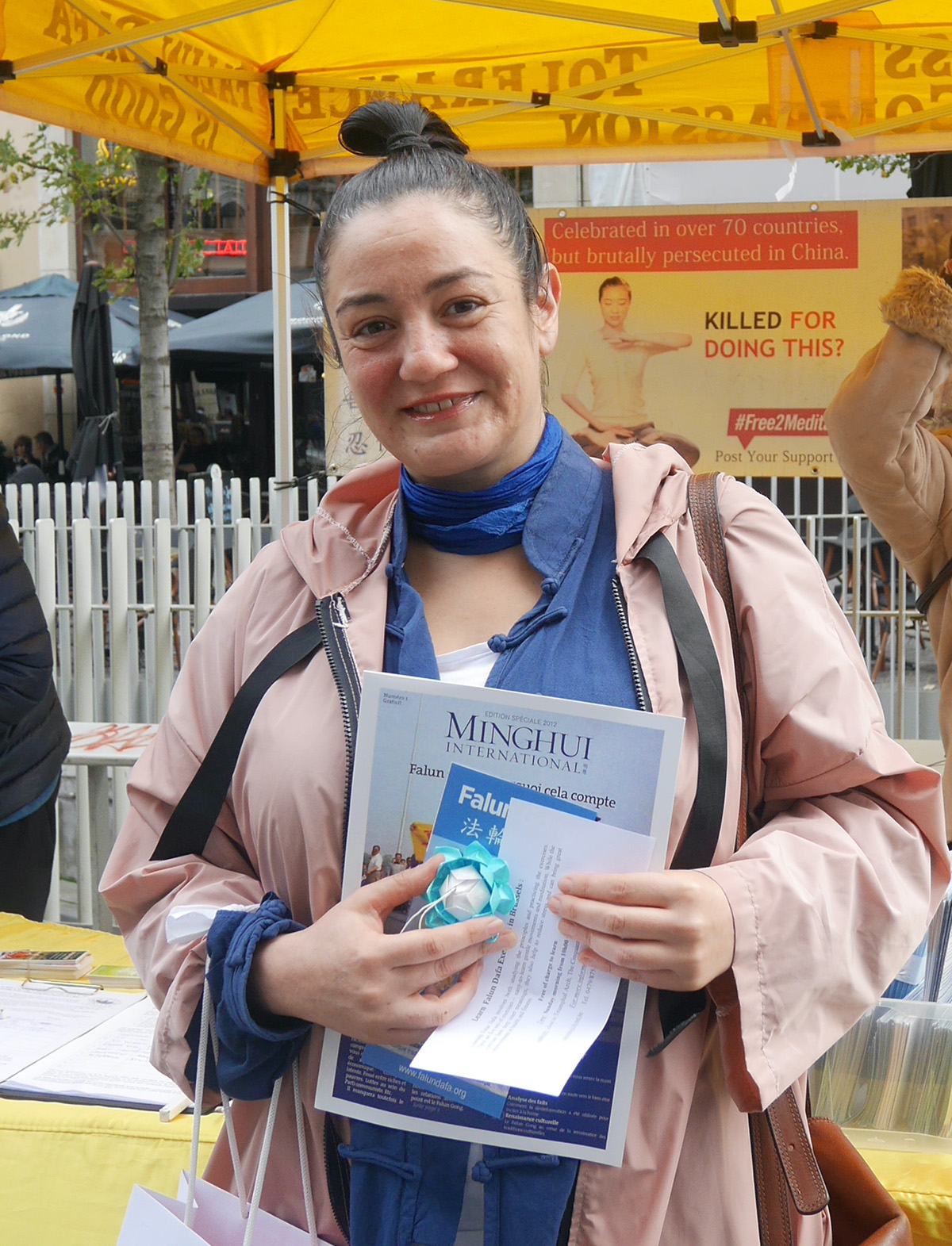 阿涅斯·汤泉(Agnès Tonquang)来到展桌前向学员询问,在哪里可以学炼法轮功?