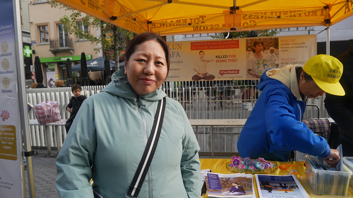 她还表示当今生活、精神压力都很大。她说:“我不是很年轻,不能够做高强度的运动,听父母说修炼法轮功对精神放松和身体健康有很好的效果。今天看到你们在这里,所以来问问。”