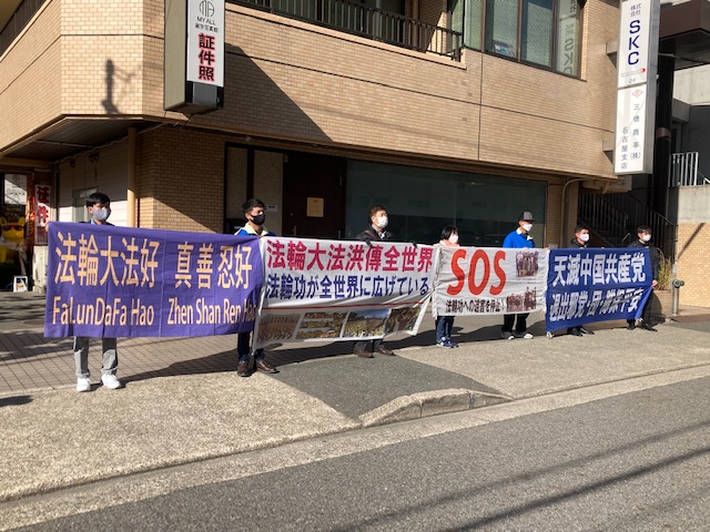 法轮功学员们在中国驻名古屋总领事馆前,打出了“法轮大法好 真善忍好”、“法轮大法洪传全世界”、“SOS停止迫害法轮功”及“天灭中国共产党 退出邪党团队保平安”的中日文横幅。