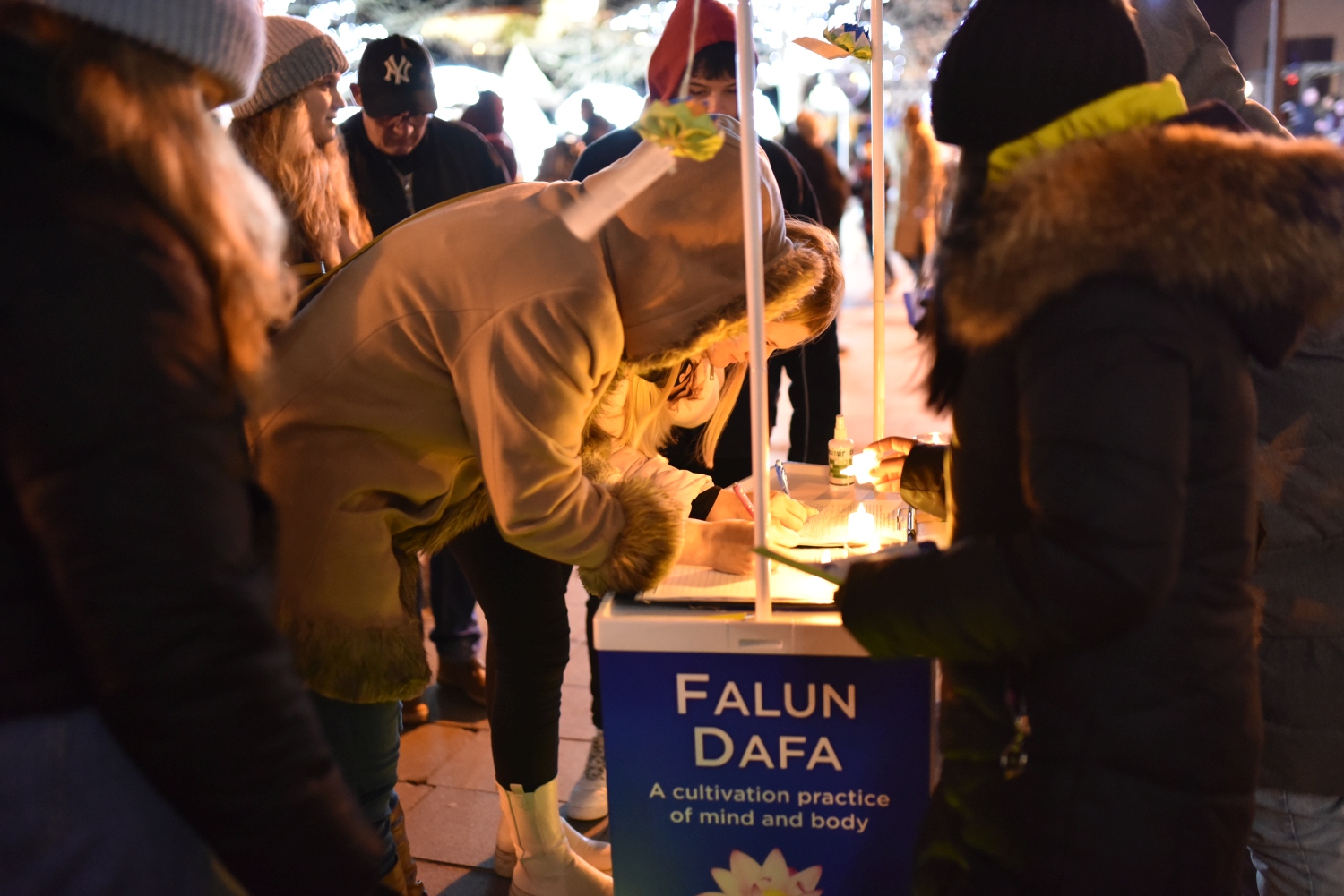 由于法轮功学员经常在此举办类似的讲真相活动,所以有的人已经在支持学员反迫害请愿书上签过名,其中包括一群年轻人。上次,他们听到中共迫害法轮功学员的真相后,就签了名要帮助制止迫害。这次,当他们再次遇到法轮功学员的请愿活动时,他们和一位新朋友在一起。他们告诉那位朋友:“你去签名支持,这样就能制止中共迫害法轮功学员。”他们的朋友随即在请愿书上签了字。