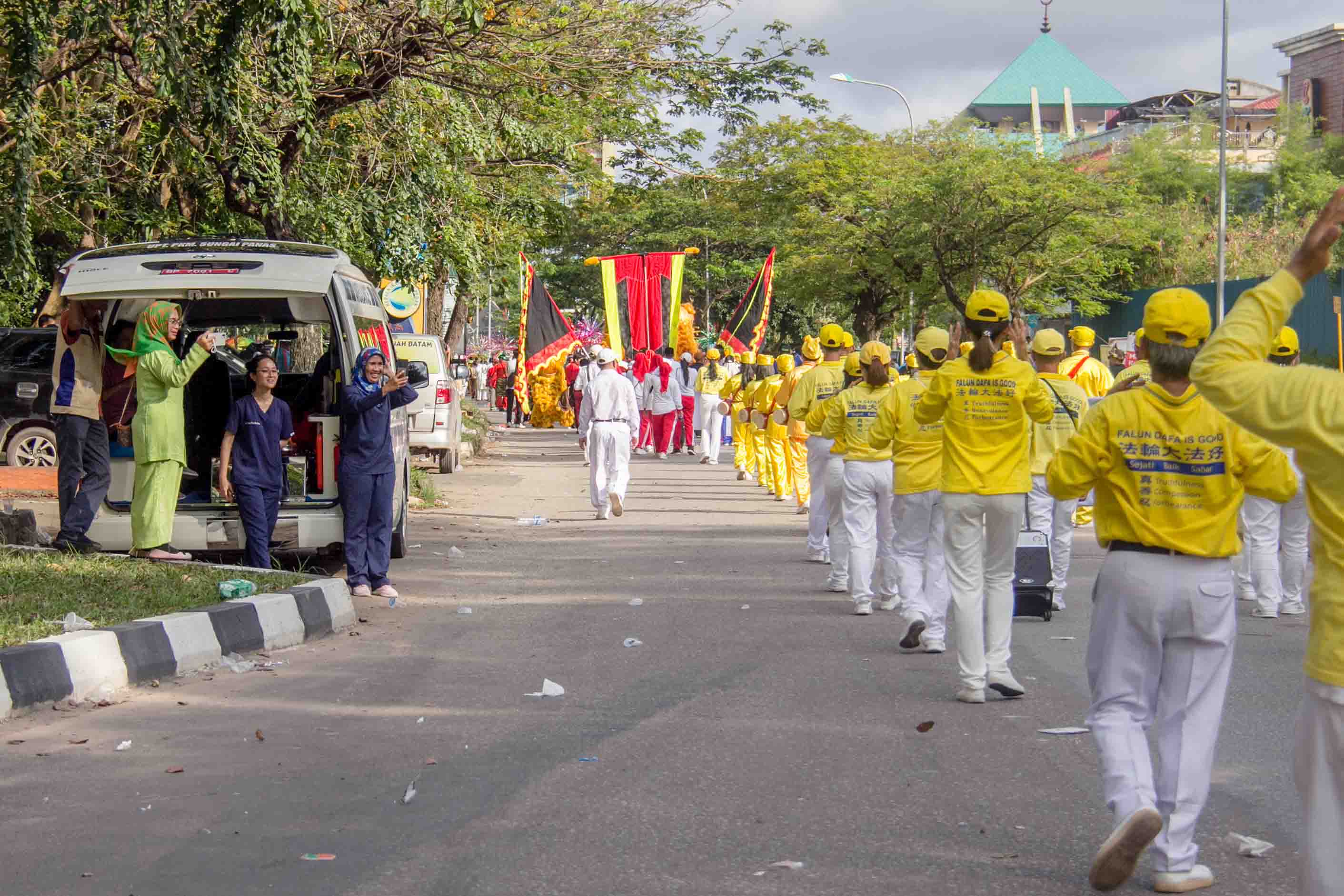 许多观看的市民向队伍两侧随行的学员询问,什么是法轮大法,并且接收学员分发给他们的介绍传单。据当地媒体的报导,当日来观看巴丹市周年庆文艺游行的市民高达一万多名。