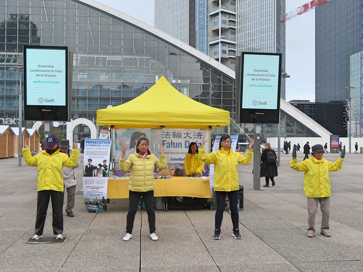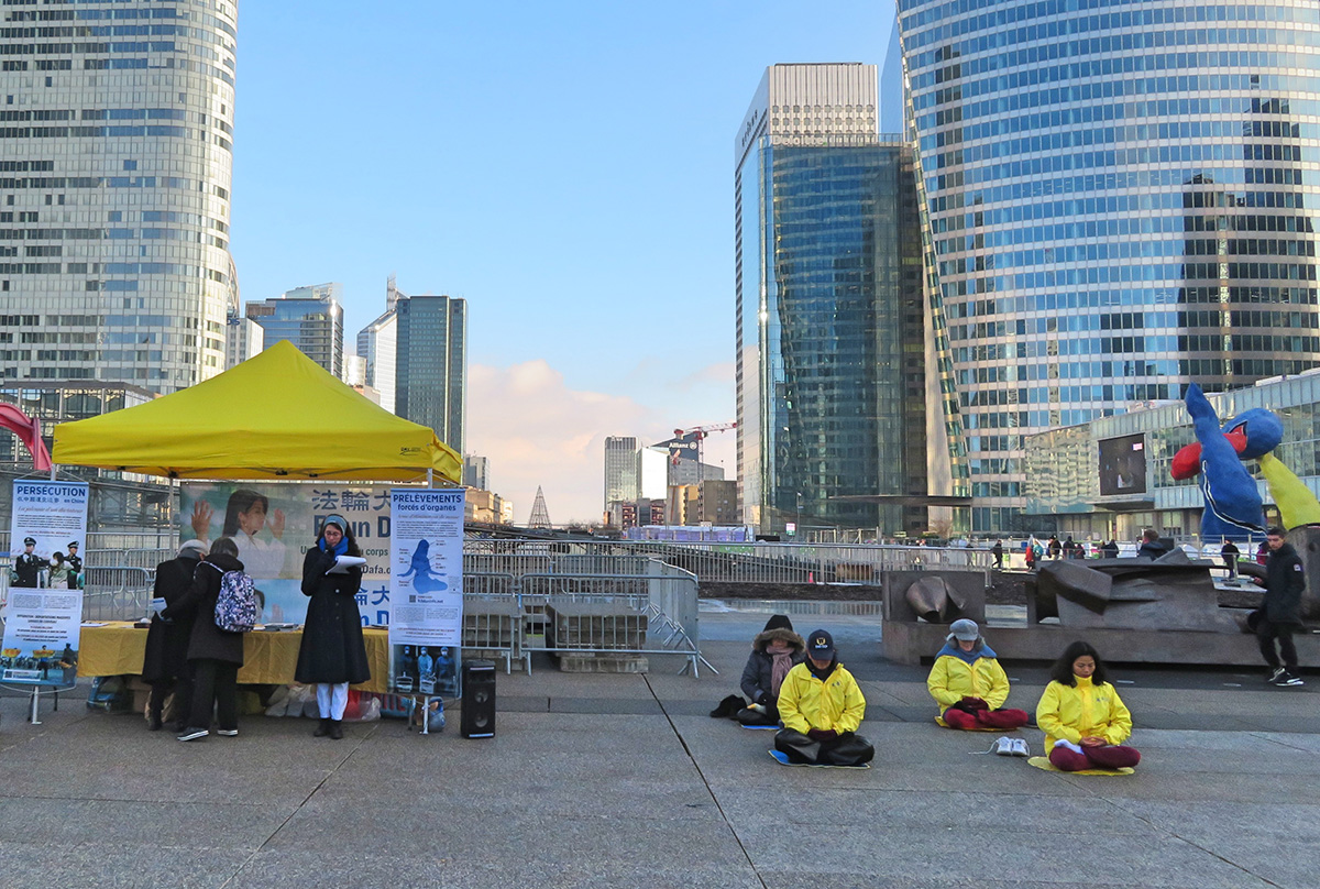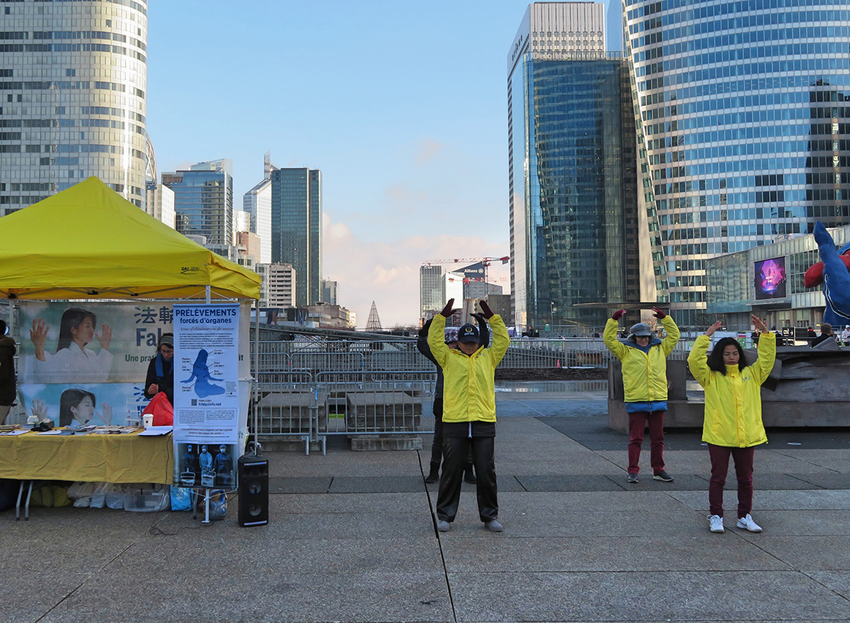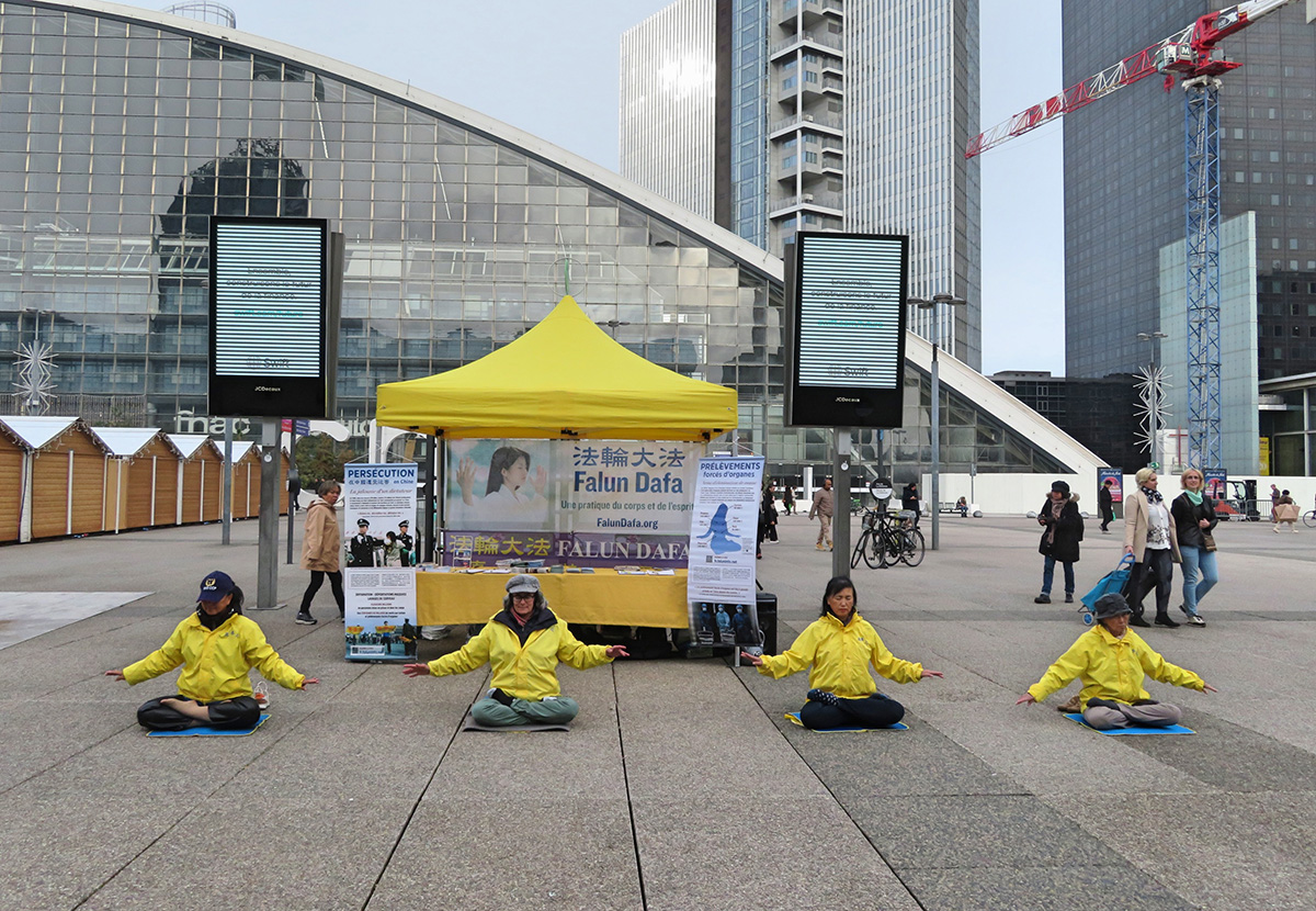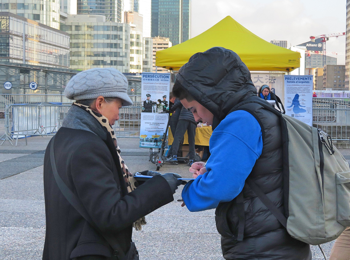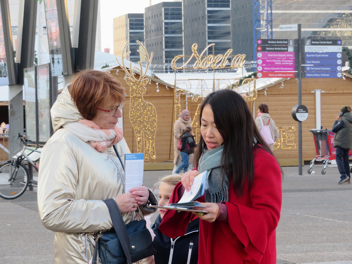 拉德芳斯(La Défense)位于巴黎西北部,是巴黎大区的重要商业区,也是欧洲金融活动中心。这天天气寒冷,广场上人来人往。法轮功活动地点的对面是圣诞市场,人们从圣诞市场出来,从办公楼下来,从地铁站上来经过此地。很多人第一次听说法轮功,对中共迫害法轮功表示难以想象,他们有的接过传单,有的在征签表上签字支持法轮功学员反迫害。人们感谢法轮功学员告诉他们真相,鼓励法轮功学员坚持下去,希望早日停止迫害。