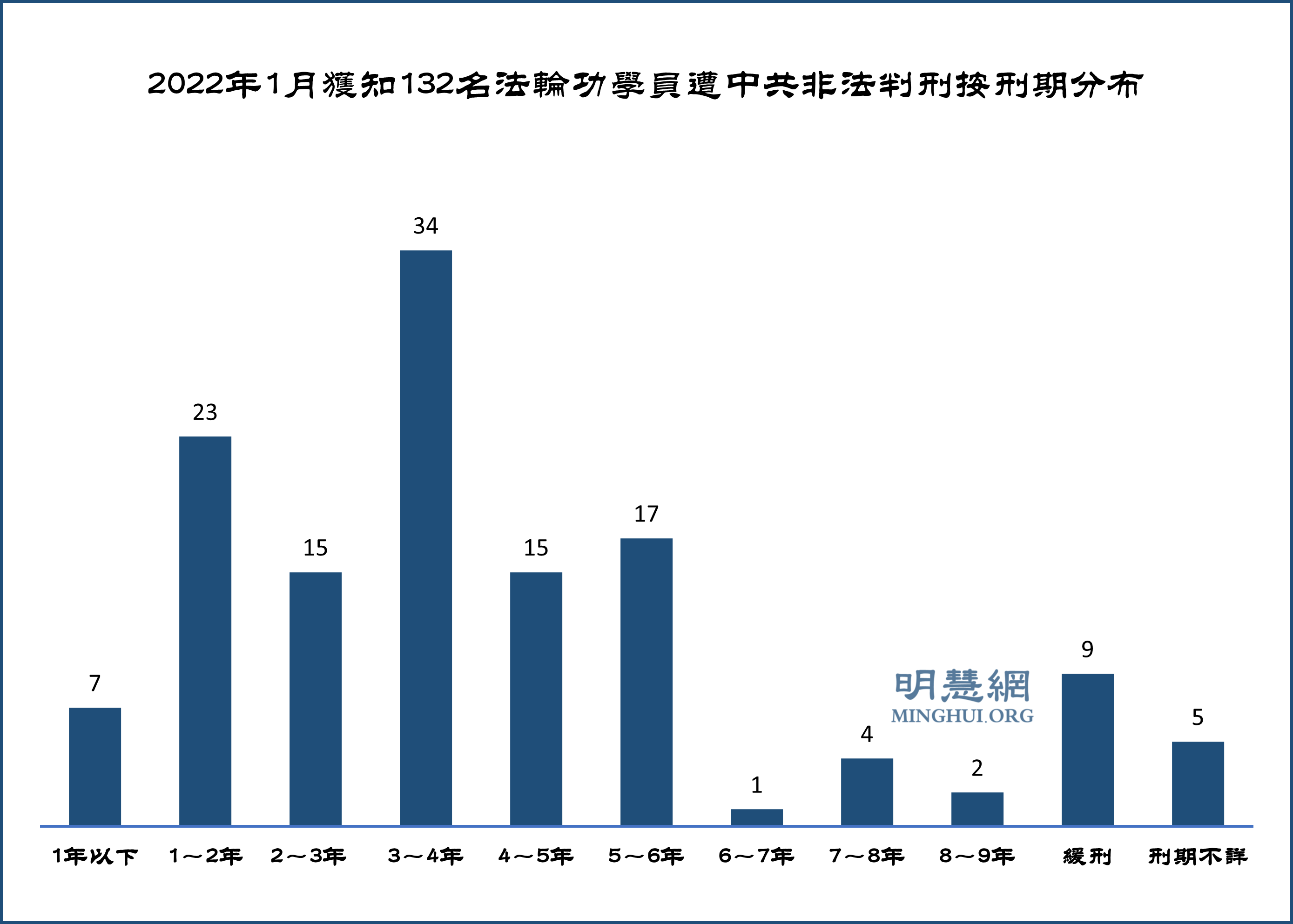 图1:2022年1月获知132名法轮功学员遭中共非法判刑按刑期分布