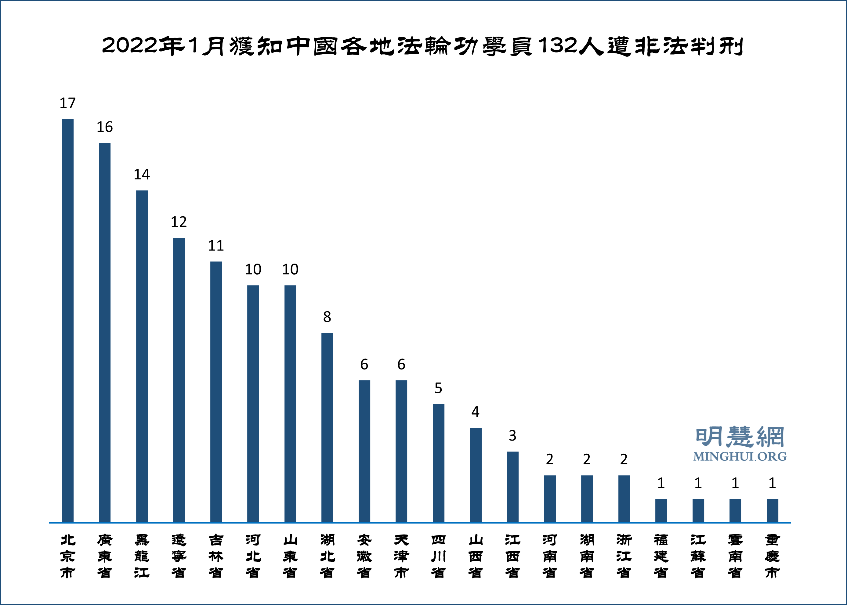 【明慧网二零二二年二月十日】(明慧网通讯员综合报道)又一个欢度新年、合家团圆的日子到来了,可是在中国大陆被中共迫害得生离死别难以团圆的家庭有多少?二零二二年一月份新年期间获知有132名法轮功学员被非法判刑,其中36人2022年被枉判,88人二零二一年被枉判,8人在二零二零年已经被枉判。非法判刑分布于中国大陆的二十个省、自治区、直辖市,最严重地区是:北京市17人,冬奥会前夕,许那等11名法轮功学员二零二二年一月十四日遭中共非法判刑;其次是广东省16人,黑龙江14人,辽宁省12人,吉林省11人,河北省10人,山东省10人。