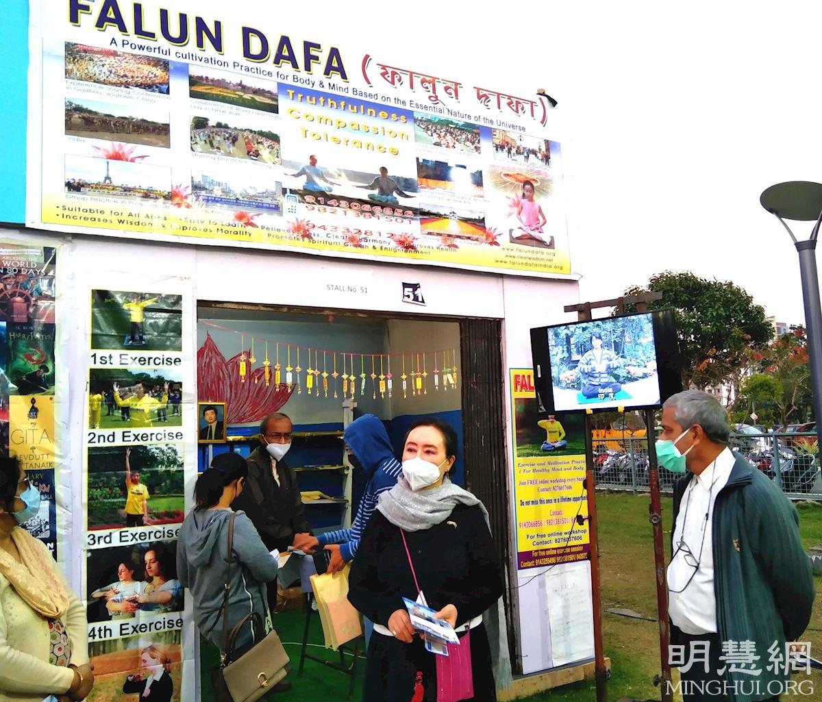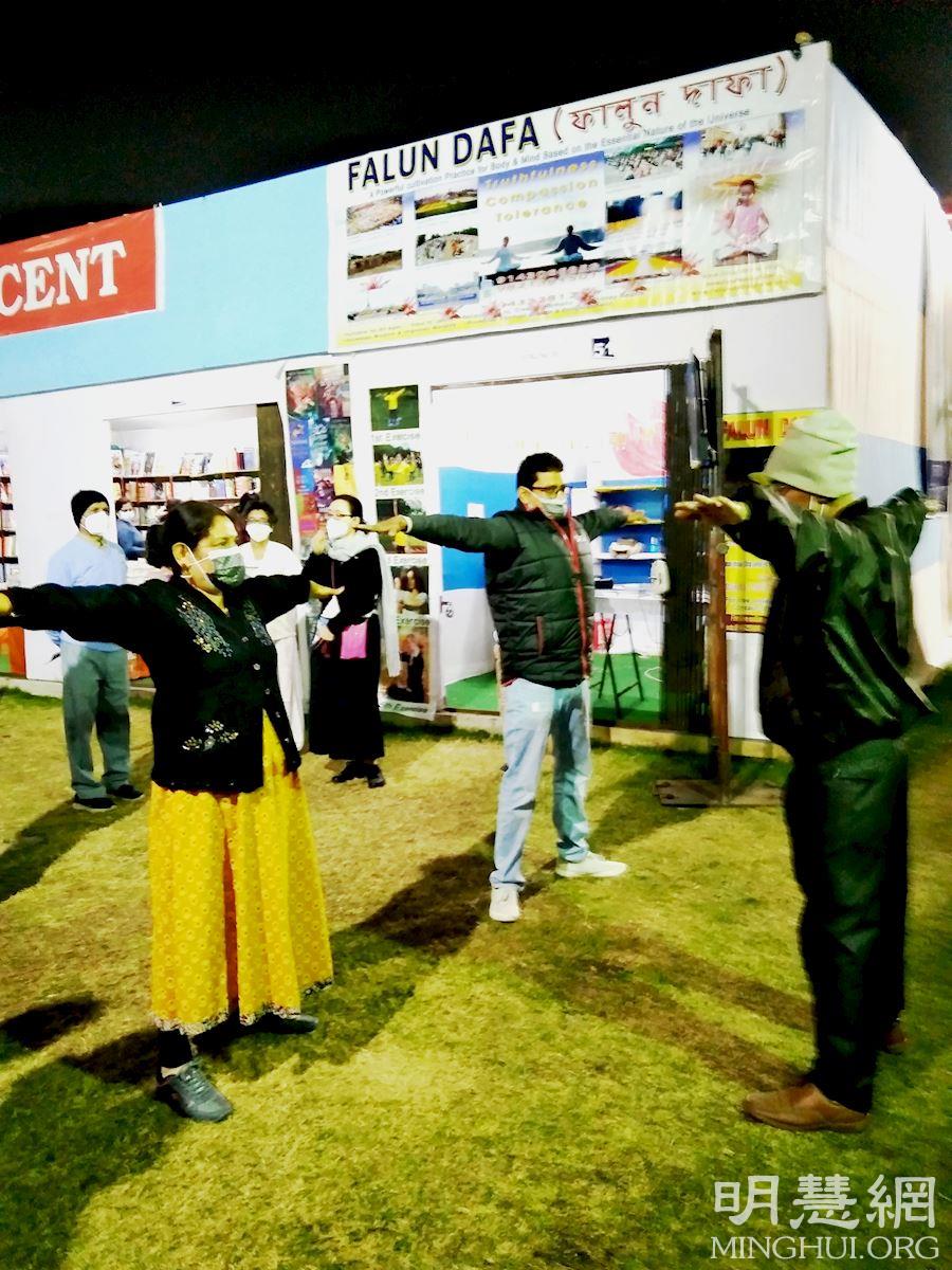 学员们在展位上展示了介绍法轮功的图片,还有孟加拉语和英语版的《转法轮》和《法轮功》书籍。学员们在现场播放了介绍法轮功的录像,吸引了好奇的参观者来到展位。不少人观看教功录像后,当场学功,并购买法轮功书籍。
