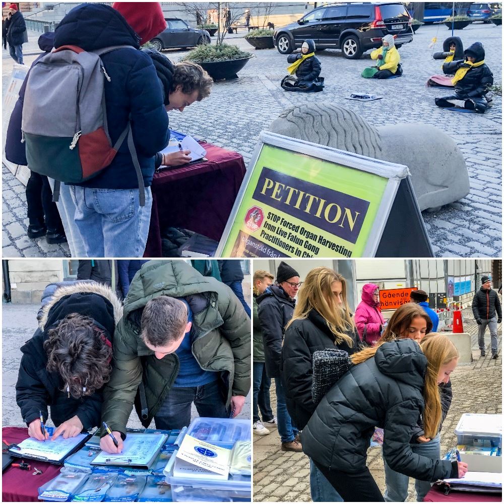 二月十二日周六,在钱币广场上的讲真相点前法轮功学员在寒风中展示功法,给过往的民众发资料。长着东方面孔莉娜(lena)是一位早已定居瑞典的日本人。她签完字后对学员说,“你们做得非常好,我当然要支持!”