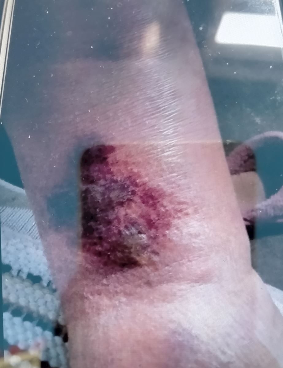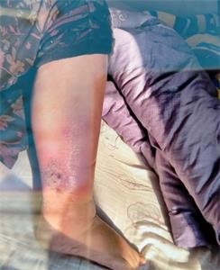张秀琴回来后不长时间,腿上就开始红肿溃烂(见下图),到现在才逐渐好转。