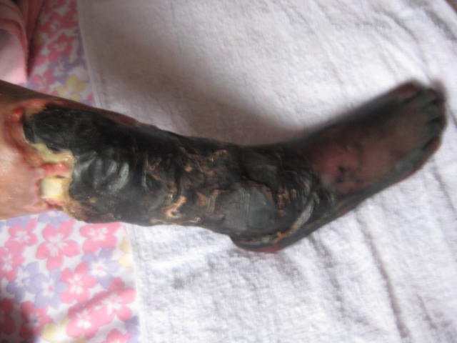![]() 宋会兰被打毒针迫害后,腿脚变黑、小腿腐烂 |