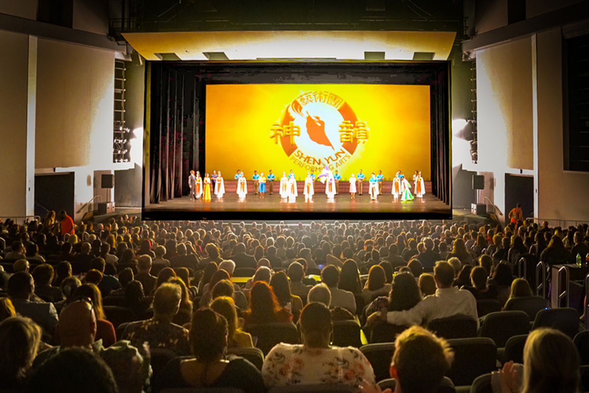 ![]() 图4:二零二二年四月九日和十日,在路易斯安那州首府巴图鲁日(Baton Rouge)水上中心表演艺术剧院(River Center Theater for Performing Arts)的三场演出全爆满。图为4月9日晚演出谢幕照。(新唐人电视台) |