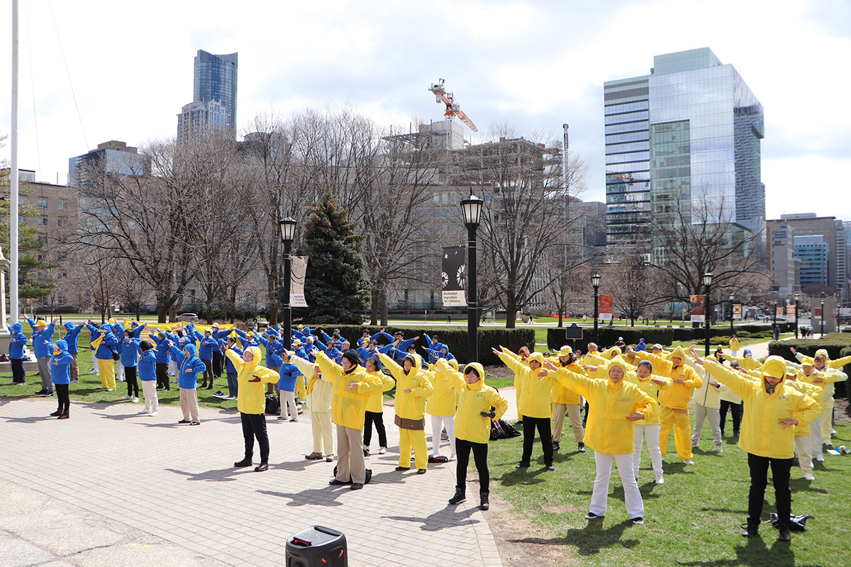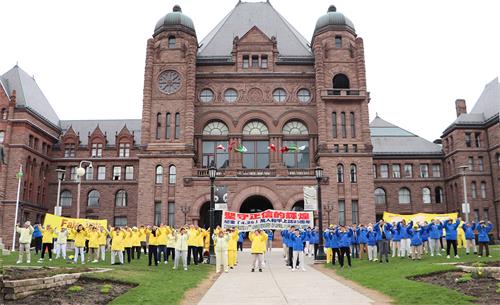 ![]() 图1~2:多伦多法轮功学员在省府大楼前集体炼功。 |