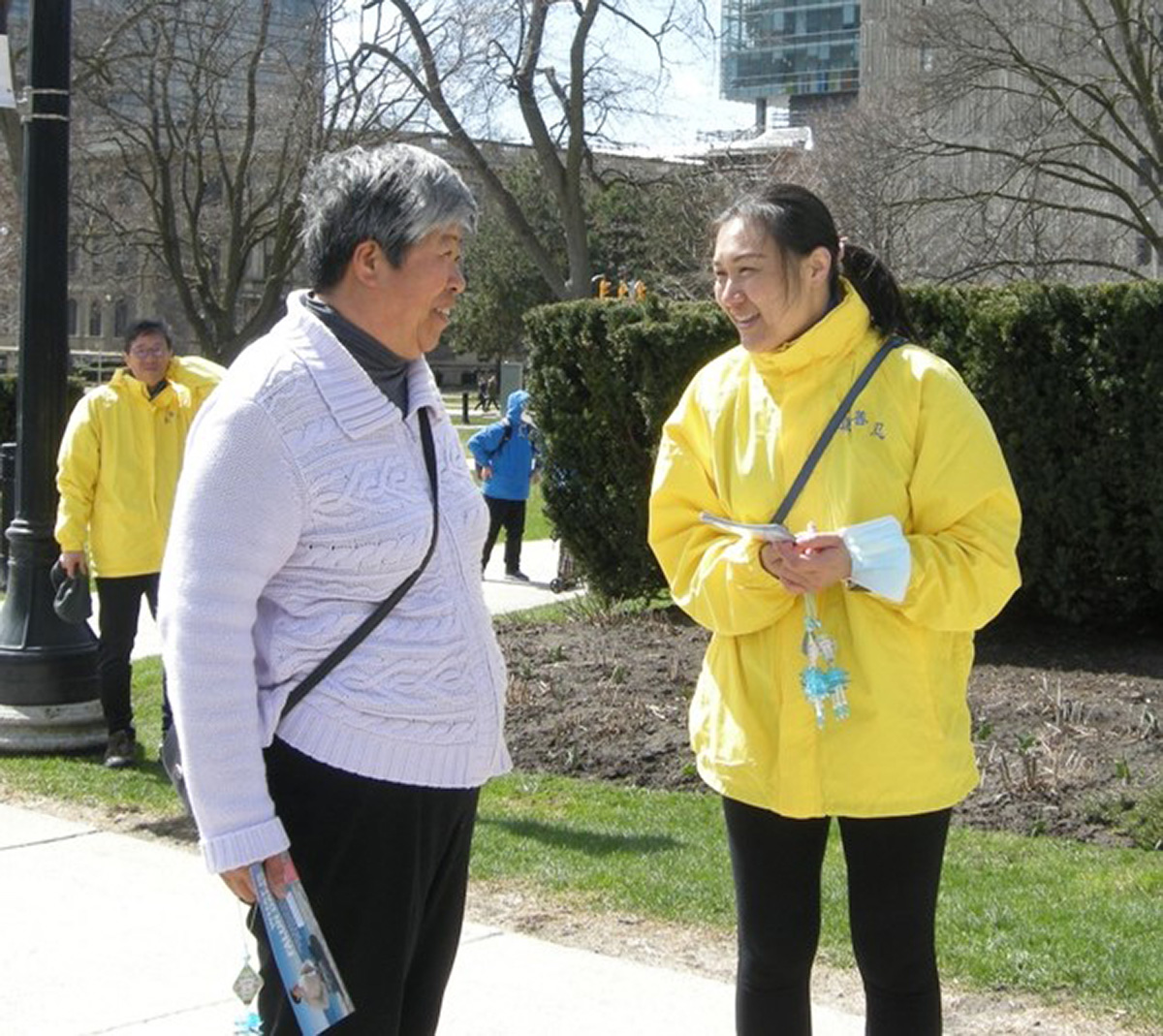 宋女士是从美国的肯塔基州过来加拿大多伦多旅游的。她经过现场看到集会就跟学员聊起来了。她说:“我知道中共很邪恶,我不修炼法轮功,但是我的爸爸、妈妈是法轮功学员。我妈妈过去身体不好,修炼了法轮功后身体变得健康起来,所以她一直都在修炼着,今年都八十八岁了。”