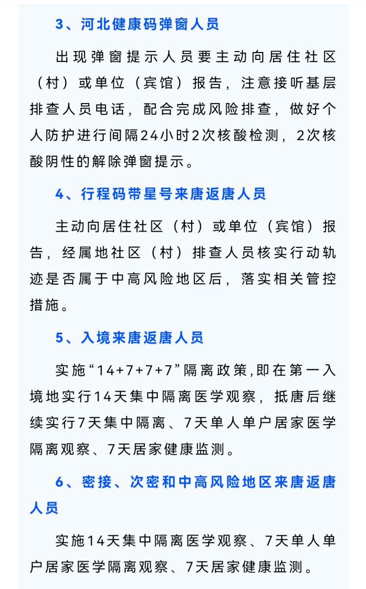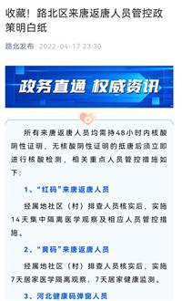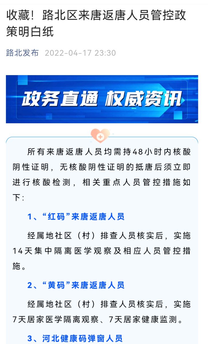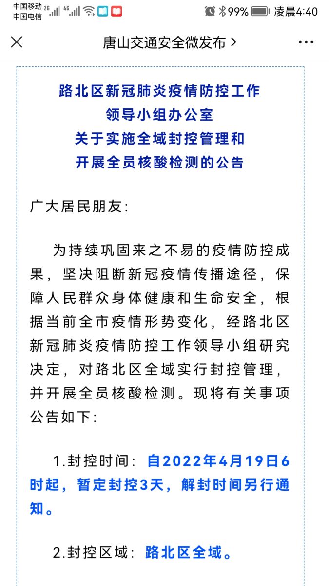 【河北省】河北唐山自二零二二年四月十七日二十四时起,各区县陆续进入封控状态。其中迁安市自十七日二十四时,实施全域严格封控管理,里不出,外不进,内不动,足不出户。滦州市、古冶区、迁西县自二零二二年四月十八日起,实施全域静态管理,解除时间另行通知。遵化市、开平区自四月十九日六时起,实施临时全域静态管理,解除时间另行通知。其它各区县,如路北区、路南区、曹妃甸、丰润、高新区、乐亭、玉田、丰南、海港经济开发区、国际旅游管岛等自二零二二年四月十九日六时起,实施全域静态管理,暂定三天。自封控开始,每人每天都做核酸。这一消息从网上疯传后引发了市区市民的恐慌,抢购猪肉、鸡蛋、蔬菜等生活必需品。