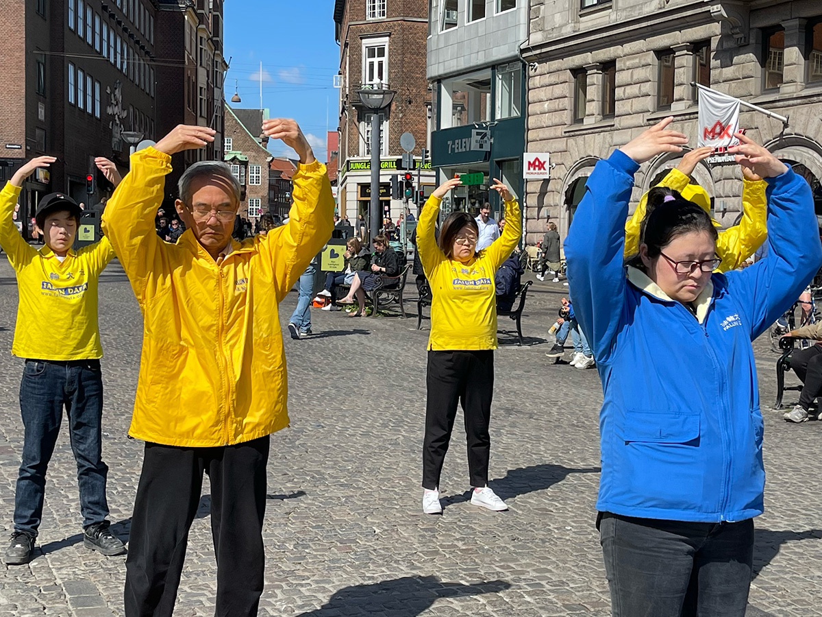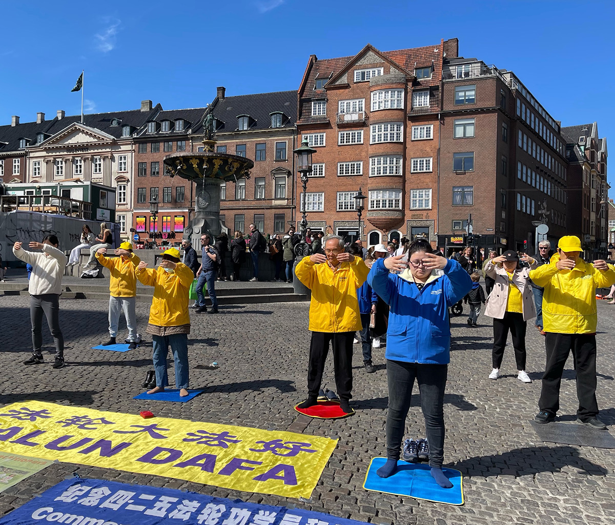 ![]() 图1:丹麦法轮功学员在哥本哈根市中心老广场(Gammel Torv)展示五套功法 |