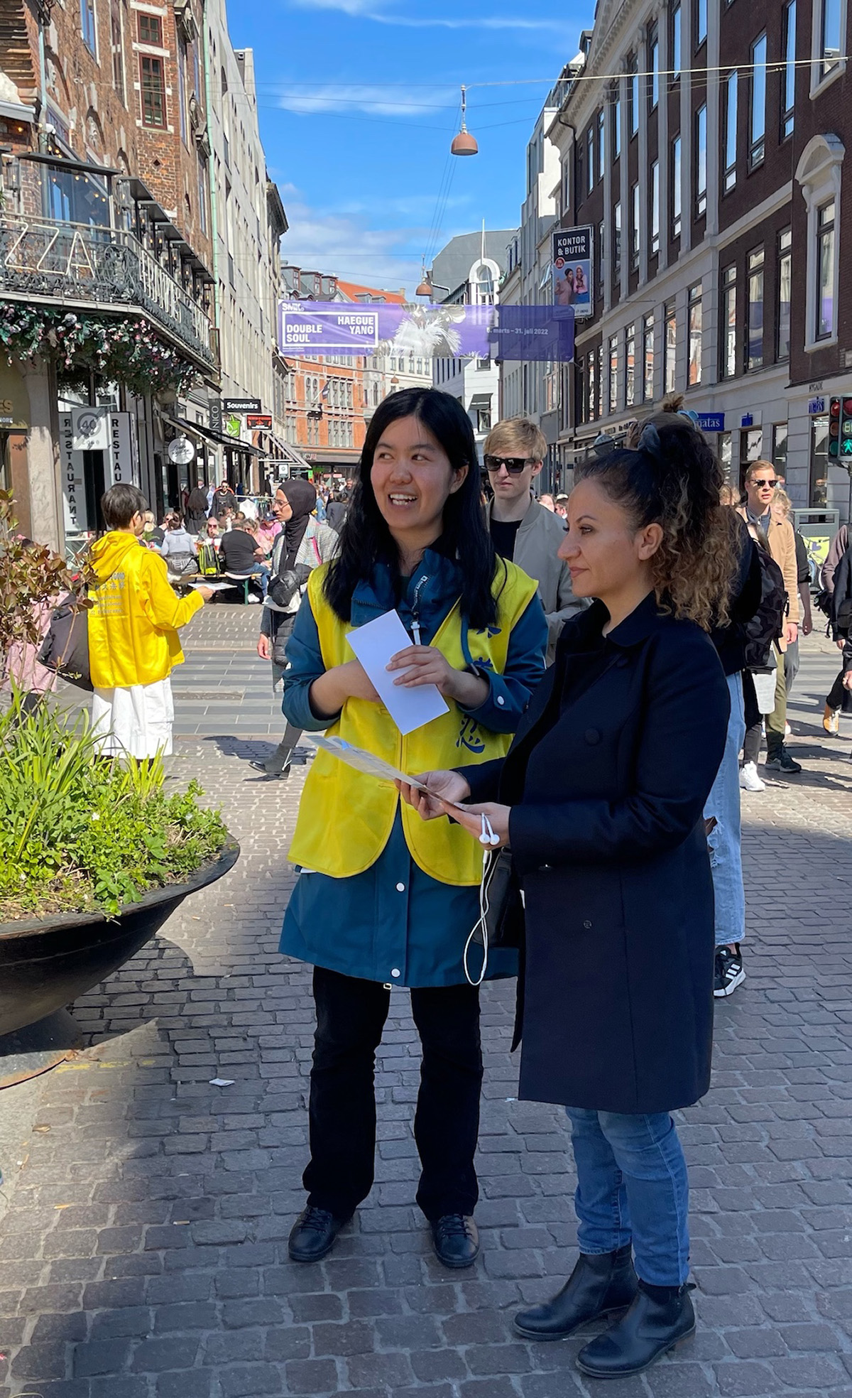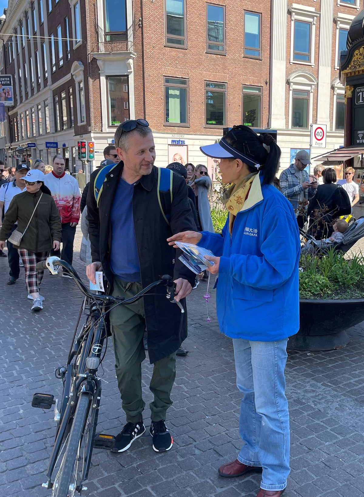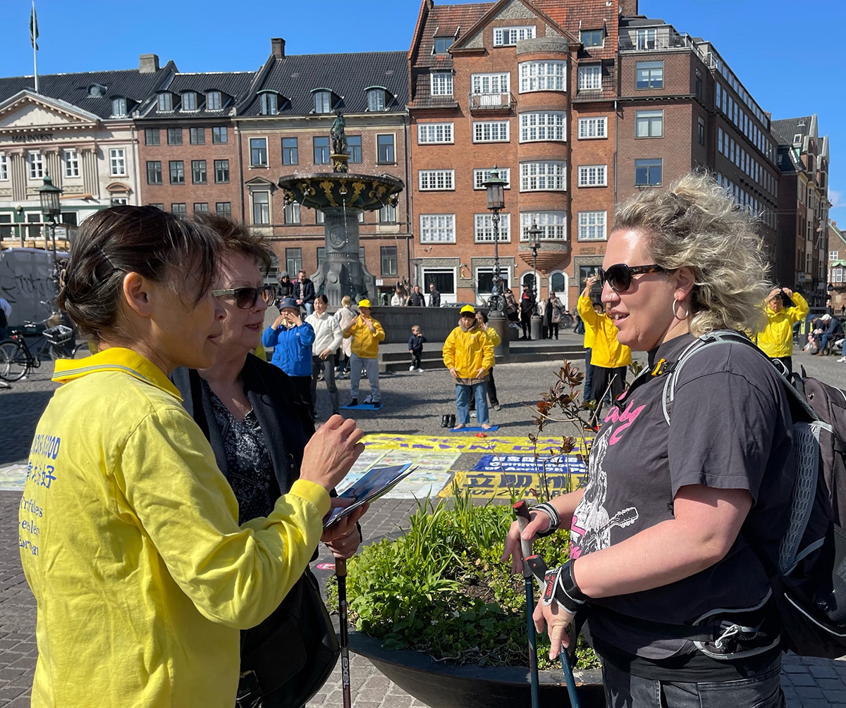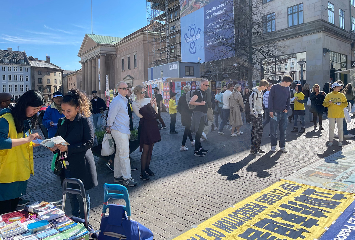![]() 图2:丹麦法轮功学员在哥本哈根市中心老广场(Gammel Torv)受到民众关注 |