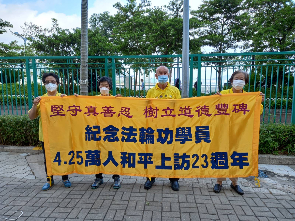 在二零二零年前每年“四·二五”香港法轮功学员都会发起游行、集会等活动。今年因应港府的“四人限聚令”,部分法轮功学员仍以二至四人一组的方式举行纪念活动。他们展示的横幅写着“纪念法轮功学员4.25万人和平上访23周年”,“坚守真善忍 树立道德丰碑”。
