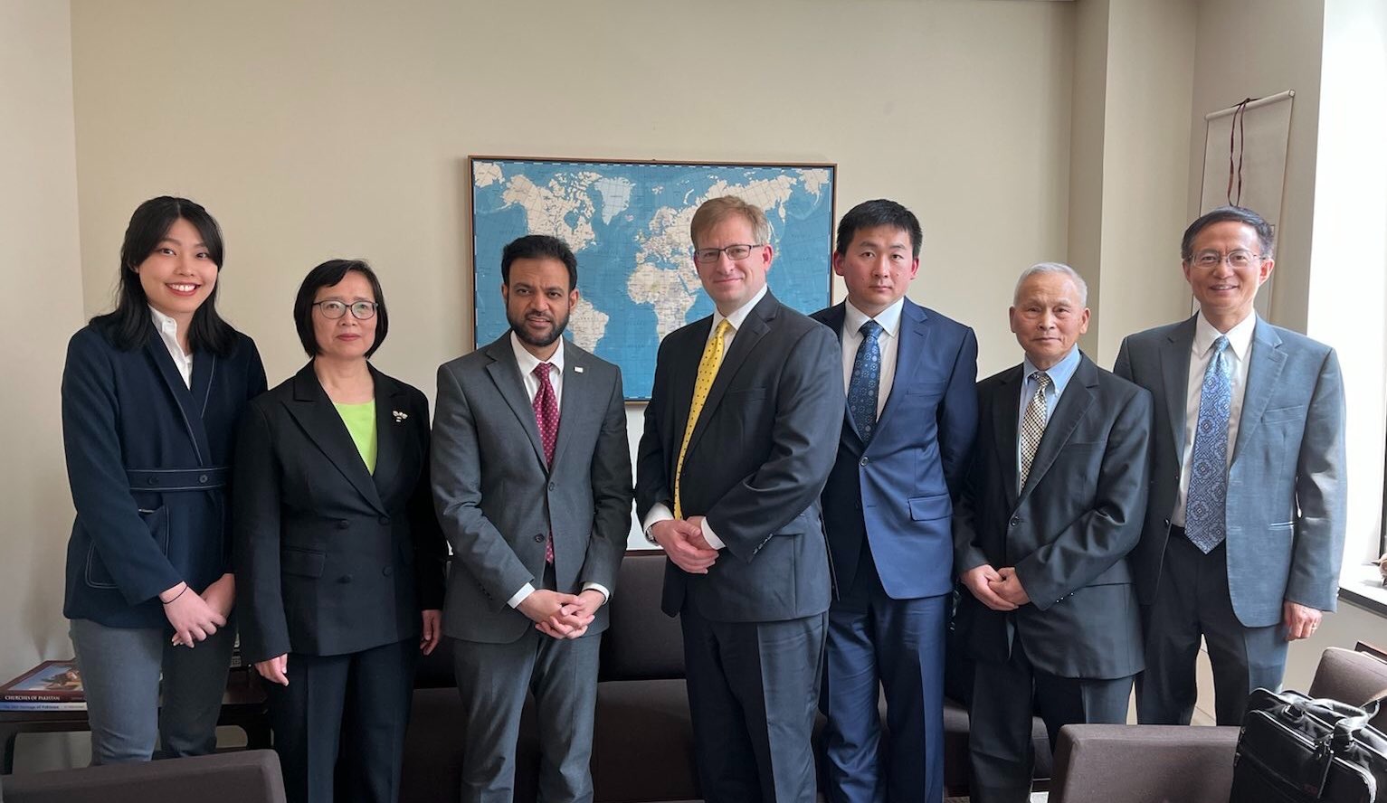 图1:美国新任国际宗教自由大使拉沙德·侯赛因(Rashad Hussain,左三)与法轮功学员合影