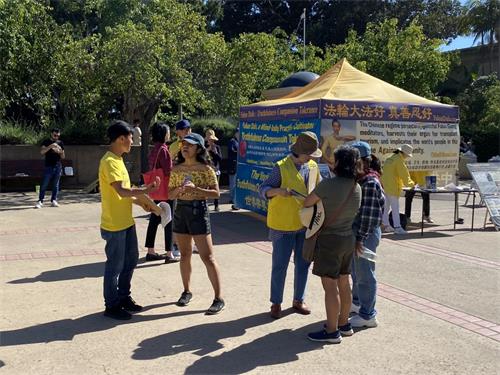 中国民主党洛杉矶分部主席葛坤,在圣地亚哥巴博亚公园遇到了法轮功学员的真相展位。