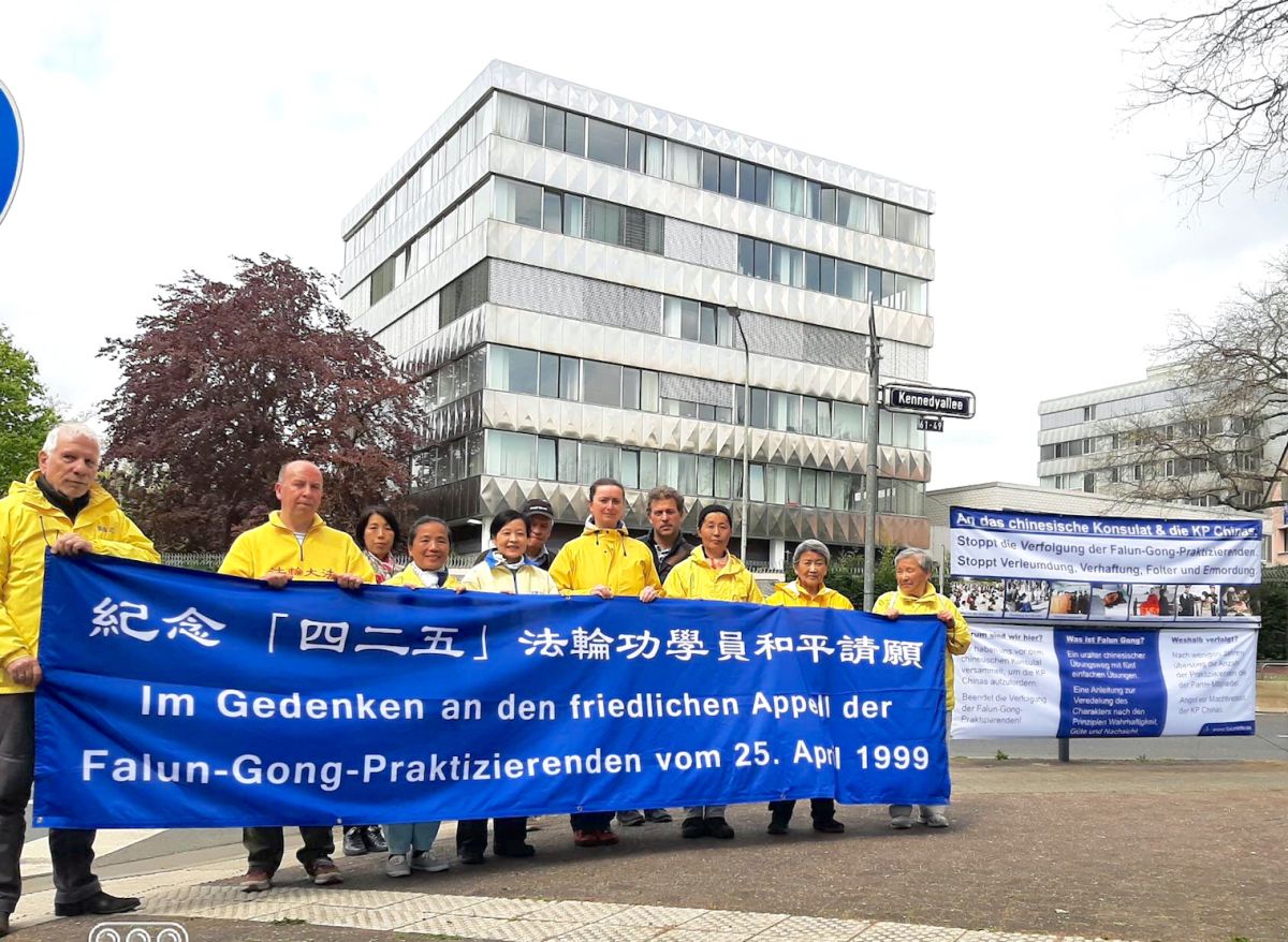 部分法兰克福的法轮功学员在中领馆前举办活动,纪念“四·二五”和平上访。当天,不少中国人和路人观看了学员们打出的横幅,并接过关于中共迫害法轮功的真相传单。