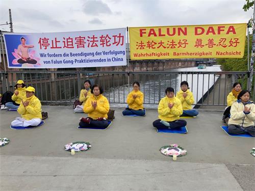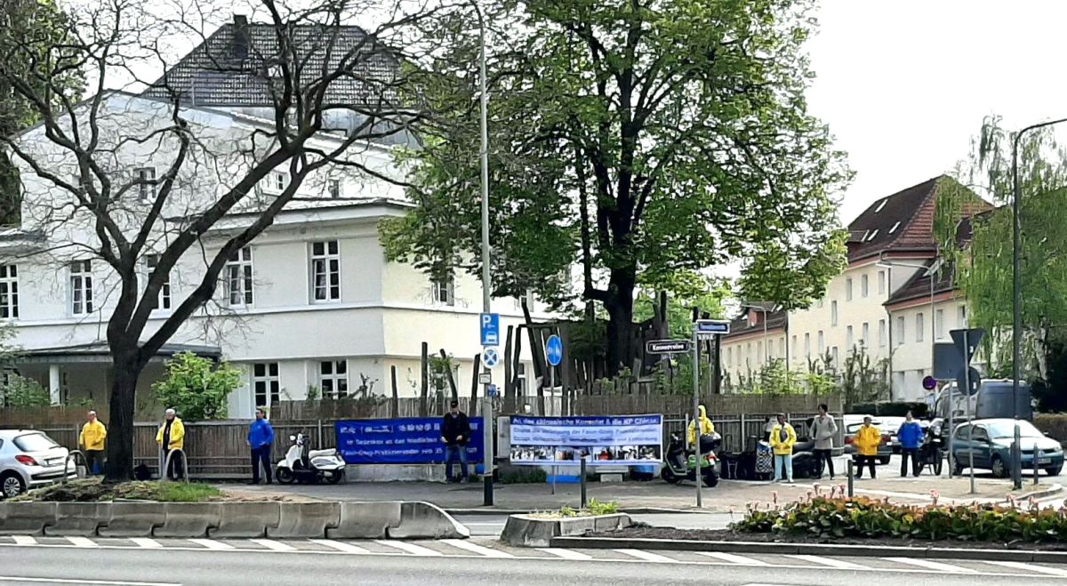 在慕尼黑中领馆斜对面街上,法轮功学员举办了和平抗议活动。