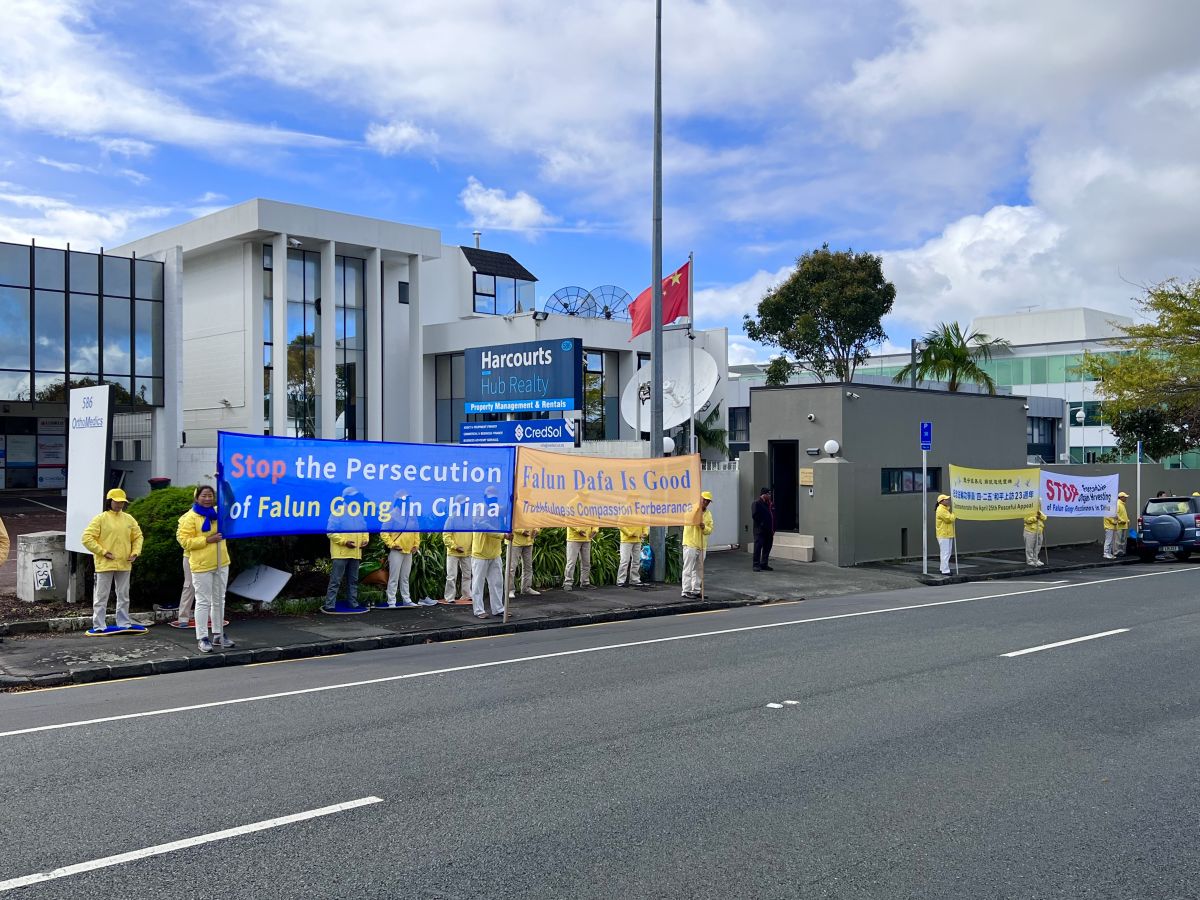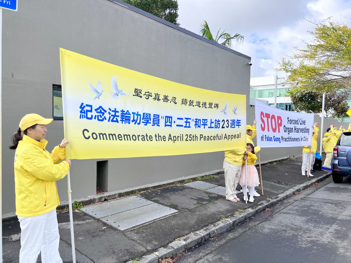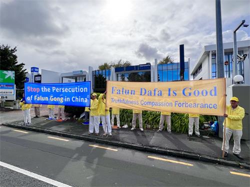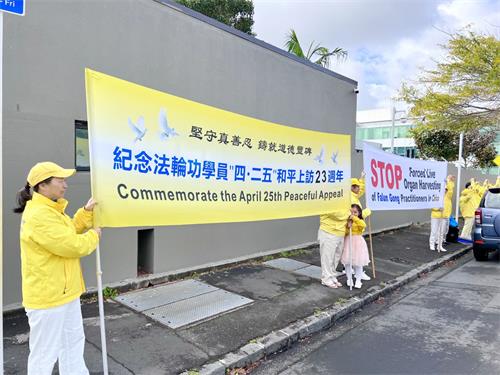 ![]() 图1~3:二零二二年四月二十五日,法轮功学员在奥克兰市中领馆前炼功。 |