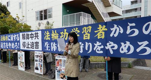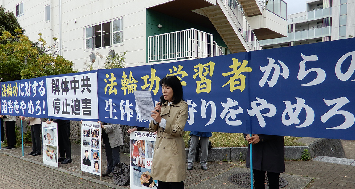 在日本工作的越南法轮功学员田先生(Mr.Tien)说:“今天是我第一次到名古屋中领馆前参加活动,纪念‘四·二五’。我要求中共立即停止对法轮功学员的迫害,立即停止活摘法轮功学员的器官。”