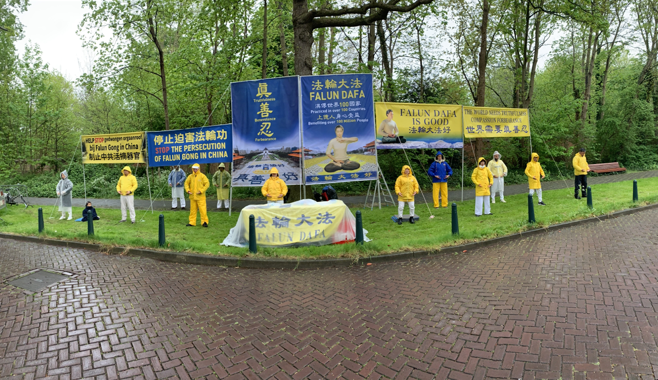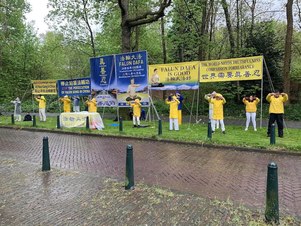 四月的荷兰正是鲜花盛开的季节,当日,天空飘起小雨。荷兰法轮功学员冒雨赶到位于海牙的中使馆,以和平的方式抗议中共非法迫害法轮功。