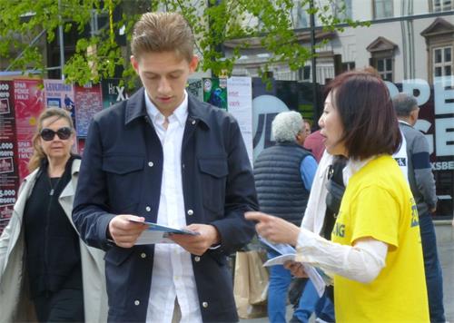 ![]() 图6:丹麦法轮功学员史蒂芬(Steffen)向过往行人派发真相传单。他的最大心愿是让人们了解法轮大法的真相。 |