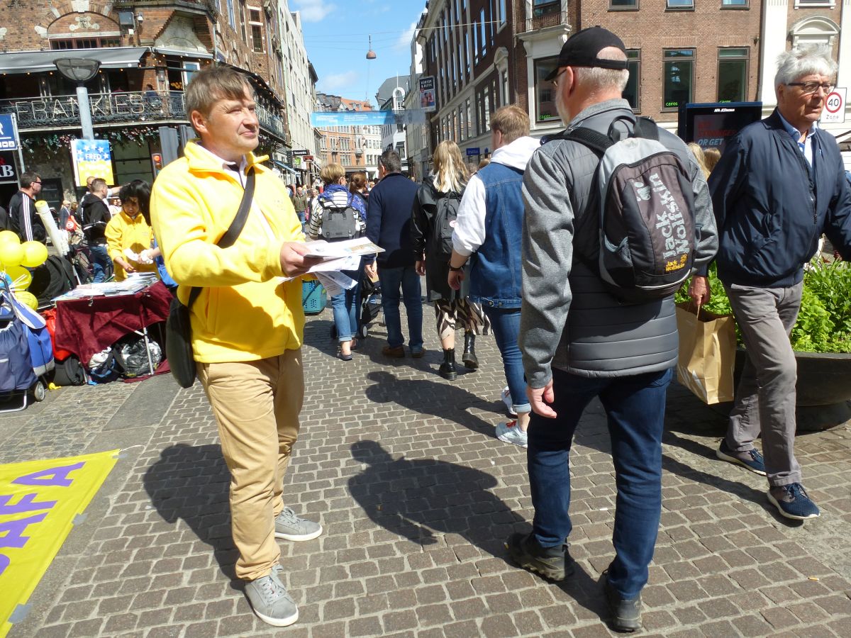 丹麦与瑞典的法轮功学员们与往常一样,自动的在市中心的老广场,铺开了横幅,放起了炼功音乐。一些学员在展示功法,另一些学员面带微笑向人们热情的打招呼,向穿梭不停的行人递上介绍法轮大法的传单。不少人看到了闹市中这安详、宁静的一隅,不由得停下了脚步,好奇地询问什么是法轮功。学员们热心而详尽给他们介绍与解释。有的行人驻足与学员长时间交谈。有的拿着法轮大法的真相传单说:“我肯定会去花时间去你们的网页上了解法轮功的!因为我感到非常有意思!“