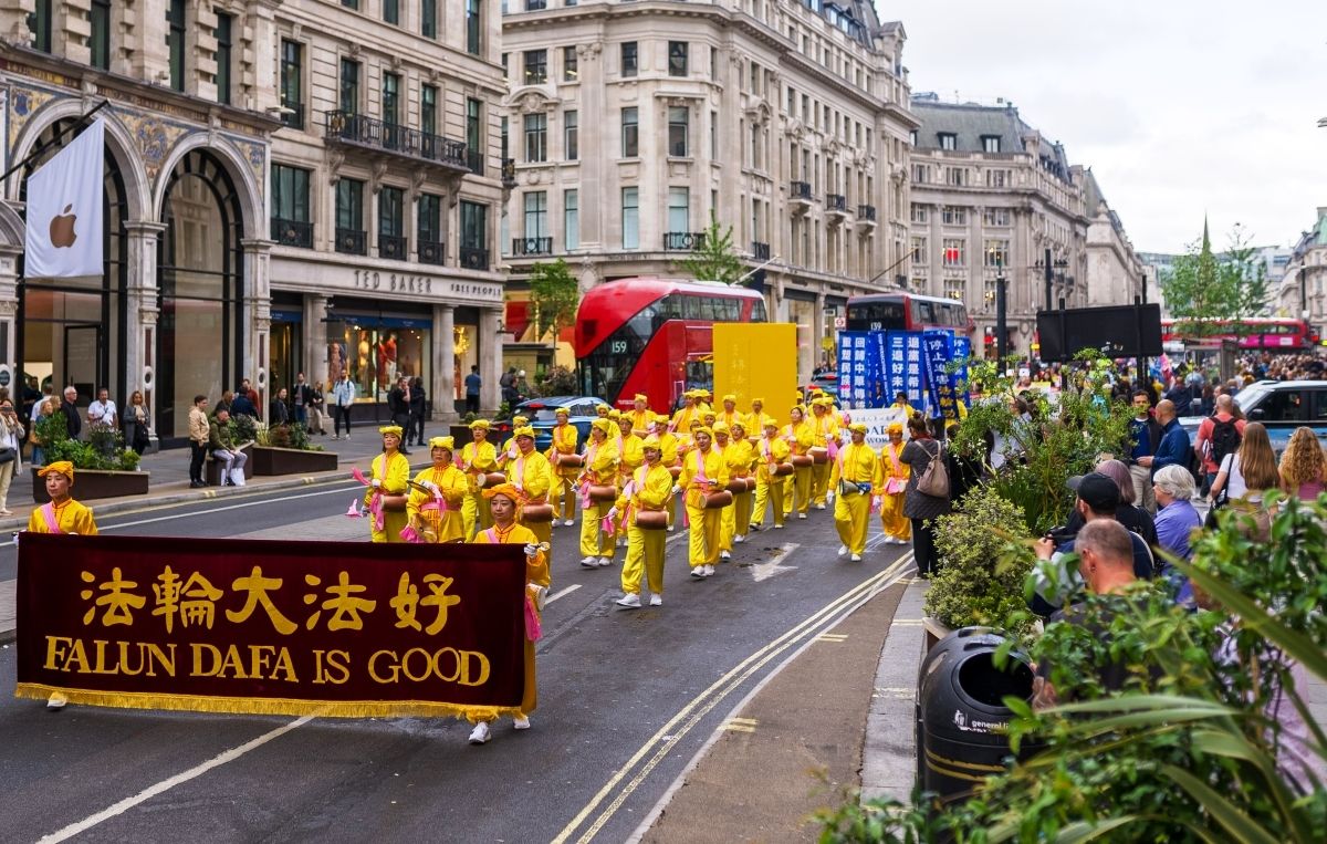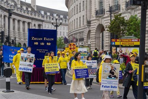 ![]() 图1~4:英国法轮功学员在伦敦市中心游行,庆祝法轮大法弘传世界三十周年。 |