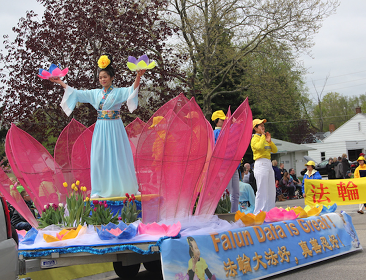 ![]() 图1:二零一八年密西根州法轮功学员参加郁金香节游行,安妮(蓝色衣服)站在花车上 |