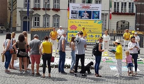 迫害刚刚开始后,几位老学员每周都去杜塞尔多夫或周边的城市讲真相。不少德国当地人是都通过几位老同修对法轮功有了一些了解。渐渐地,从最初一个小小的学法小组中发展出了科隆、杜塞尔多夫和几个周边城市的学法小组。目前,杜赛尔多夫学员每周举办三次信息点。一次在中领馆前,两次在市中心。