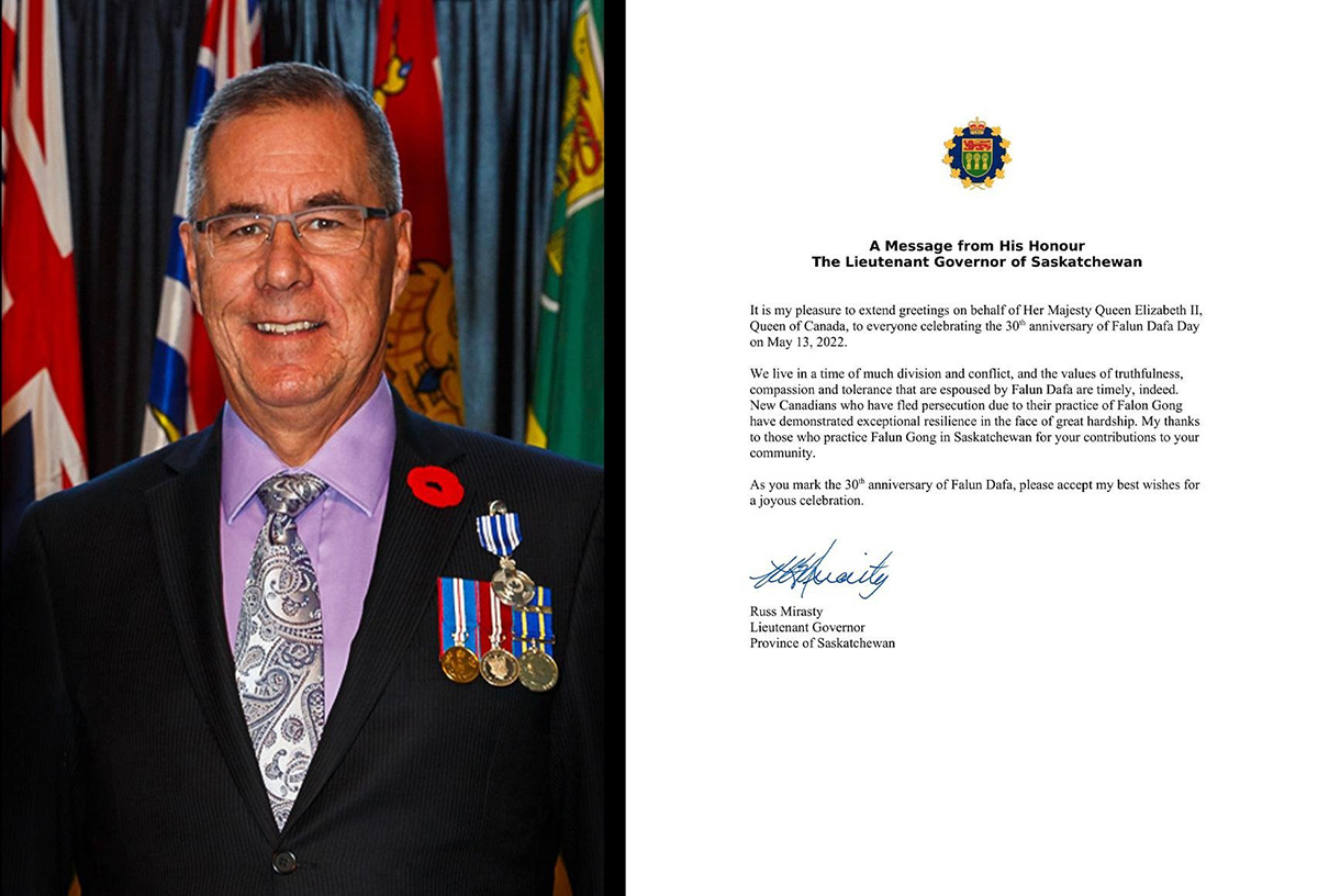 五月六日,萨斯喀彻温省萨斯卡通市(Saskatoon)升起法轮大法日旗帜,萨斯喀彻温省省督罗素·米拉斯蒂(Russell Mirasty)和萨斯喀彻温省萨斯卡通市纷纷寄上贺信,表达对法轮大法弘传三十周年的祝贺。