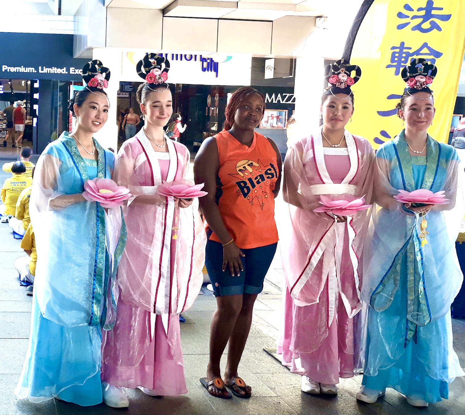 ![]() 图2:由青年法轮功学员组成的仙女队中的爱莲(Ai Lian,左一)与阿什利(Ashleigh,左二)应邀与路人合影 |