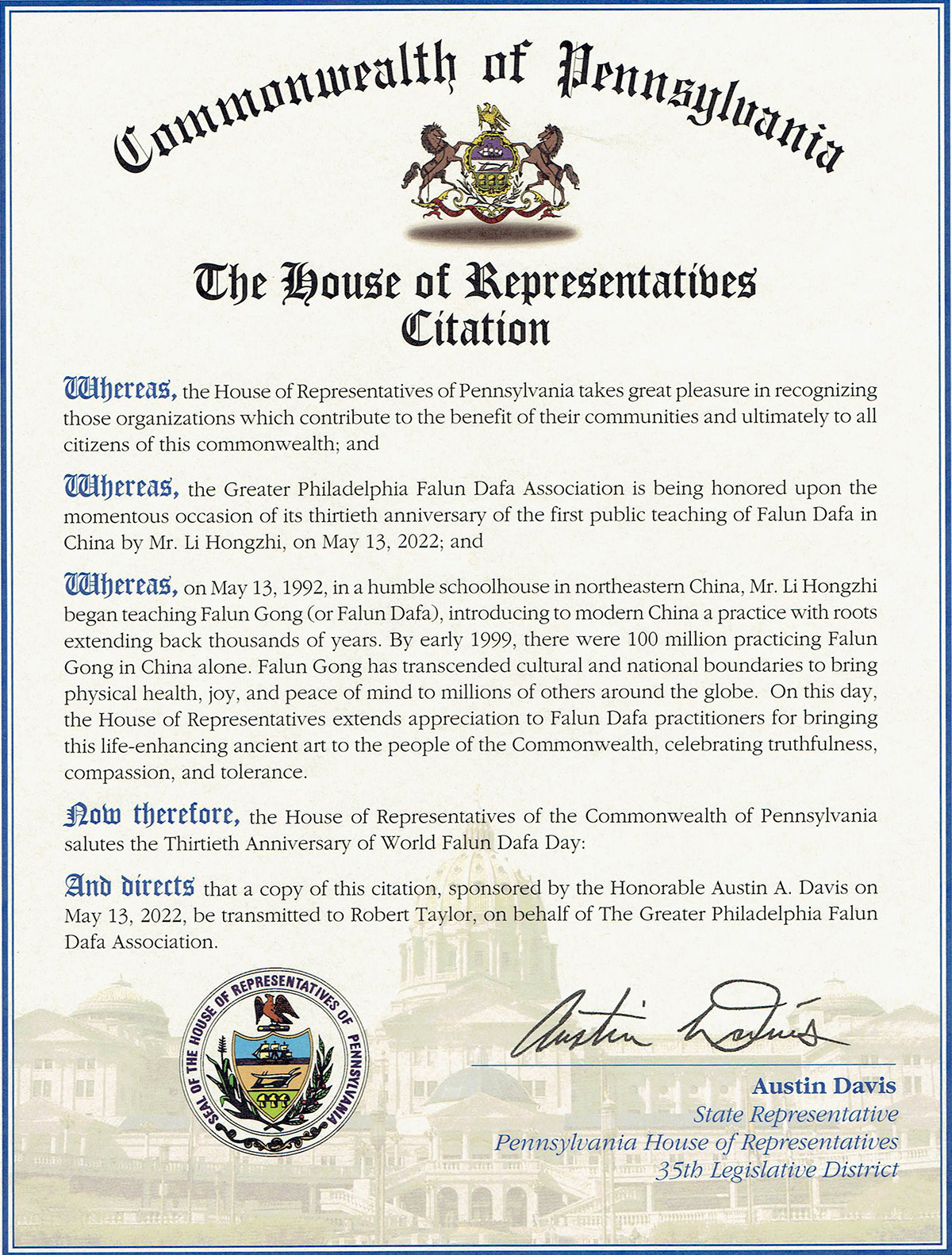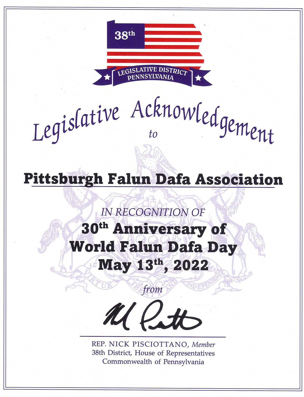 宾州州众议院第38区立法表彰匹兹堡法轮大法学会,庆祝法轮大法洪传30周年的世界法轮大法日,2022年5月13日。
