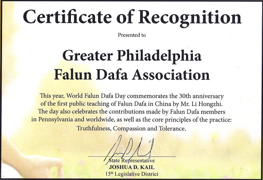 宾州第15区众议员乔舒亚·凯尔(Joshua D. Kail)为大费城法轮大法学会颁发表彰证书。