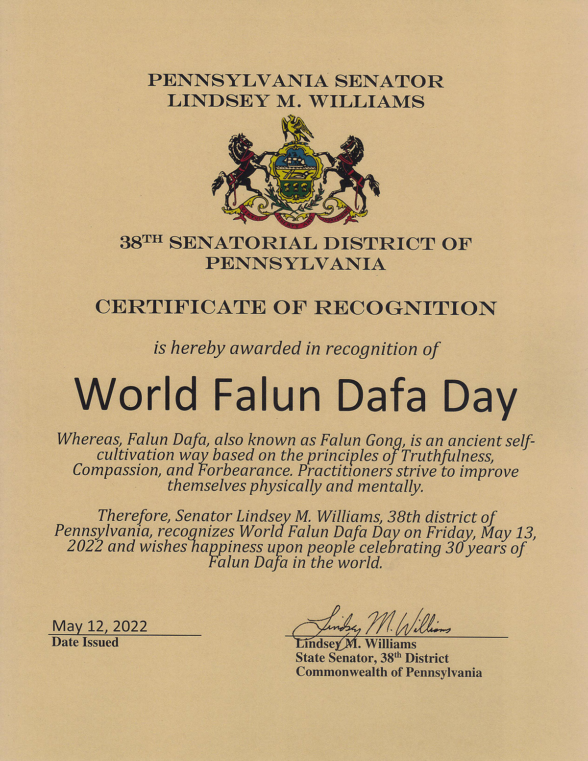 因此,宾州第38区参议员林赛·威廉姆斯(Lindsey Williams)认可2022年5月13日为世界法轮大法日。祝愿大家庆祝法轮大法洪传世间30周年快乐。
