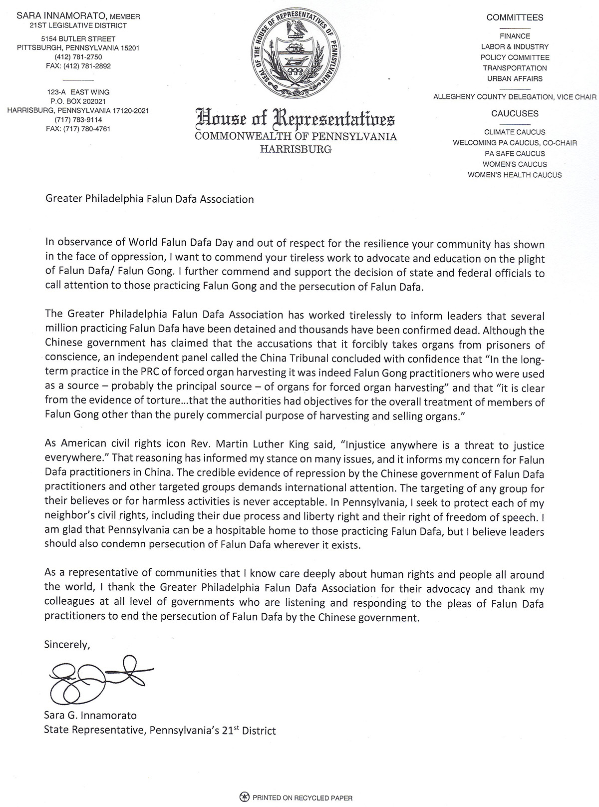 在世界法轮大法日到来之际,宾州第21区众议员萨拉·伊纳莫拉托(Sara Innamorato)致信大费城法轮大法学会,她表示强烈谴责中共对法轮功学员残酷的、持续的迫害,呼吁国际社会要更加关注对法轮功的迫害。信中写道:“为庆祝世界法轮大法日,并对你们在面对迫害时所表现出的坚韧不拔的精神表示敬意,我想赞扬你们为宣传和教育法轮功的困境所做的不懈努力。我进一步赞扬和支持宾州和美国联邦官员的决定,呼吁人们关注那些修炼法轮功的人和对法轮大法的迫害。”
