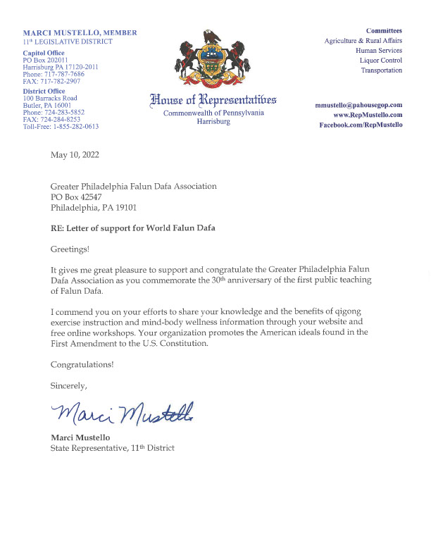 宾州众议员马西·穆斯特洛(Marci Mustello)发贺信译文如下: