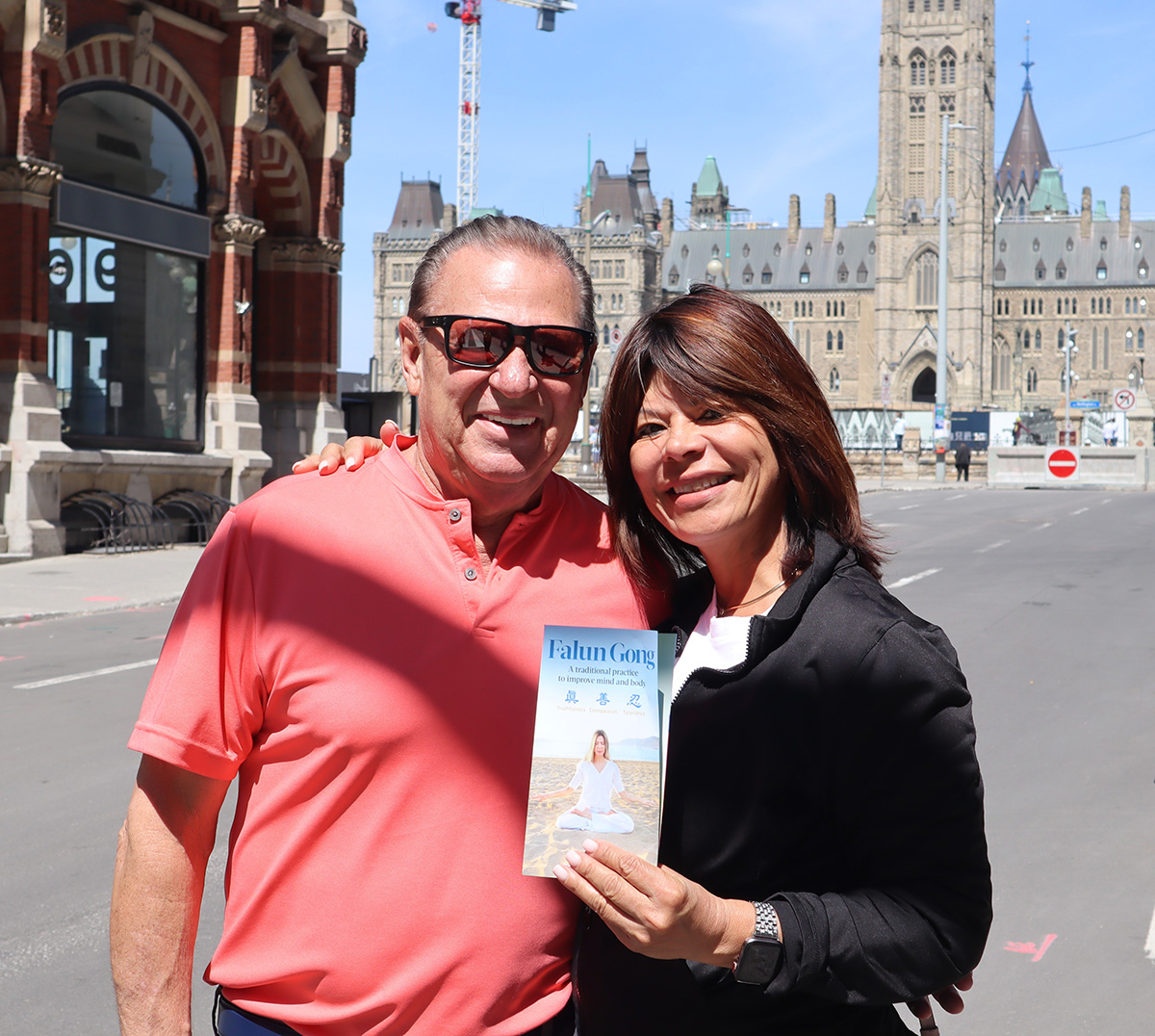 吉尔(Jill)和托尼(Tony)是到加拿大旅游的一对英国夫妻,吉尔在听完学员向她介绍大法后,她说:“我每天都会练习瑜伽,这是我第一次听说法轮功。我和丈夫在看到法轮功学员大炼功的场面后,感到好壮观。”