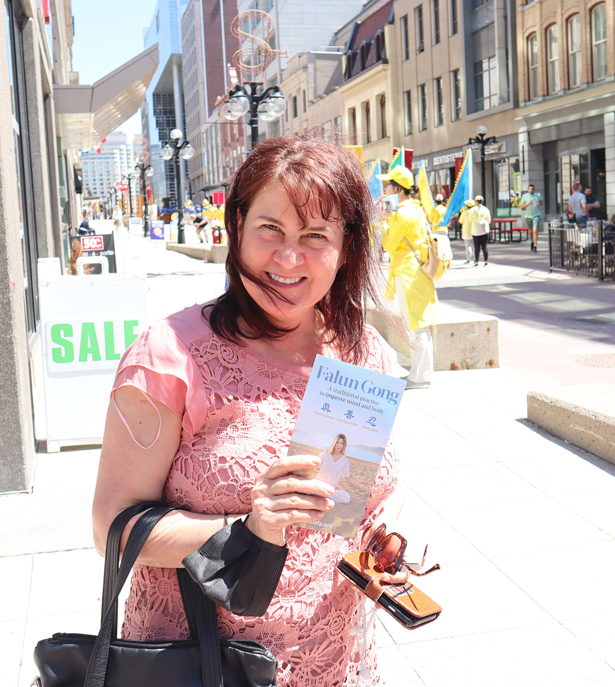 约瑟(Josee)是来自一个小镇的农场主,她非常感谢法轮功学员给她介绍了法轮功,她兴奋的说:“我明白了她告诉我的什么后,我非常的高兴,因为我想这可能就是我要尝试做的事情。因为自从病毒在全球蔓延后,很多人都很恐慌,好像都在寻找一种能解脱疫情困扰的东西,我觉得我今天找到了。所以非常的感谢。我知道可以在网上学,还可以在上网免费学。真是太好了。”