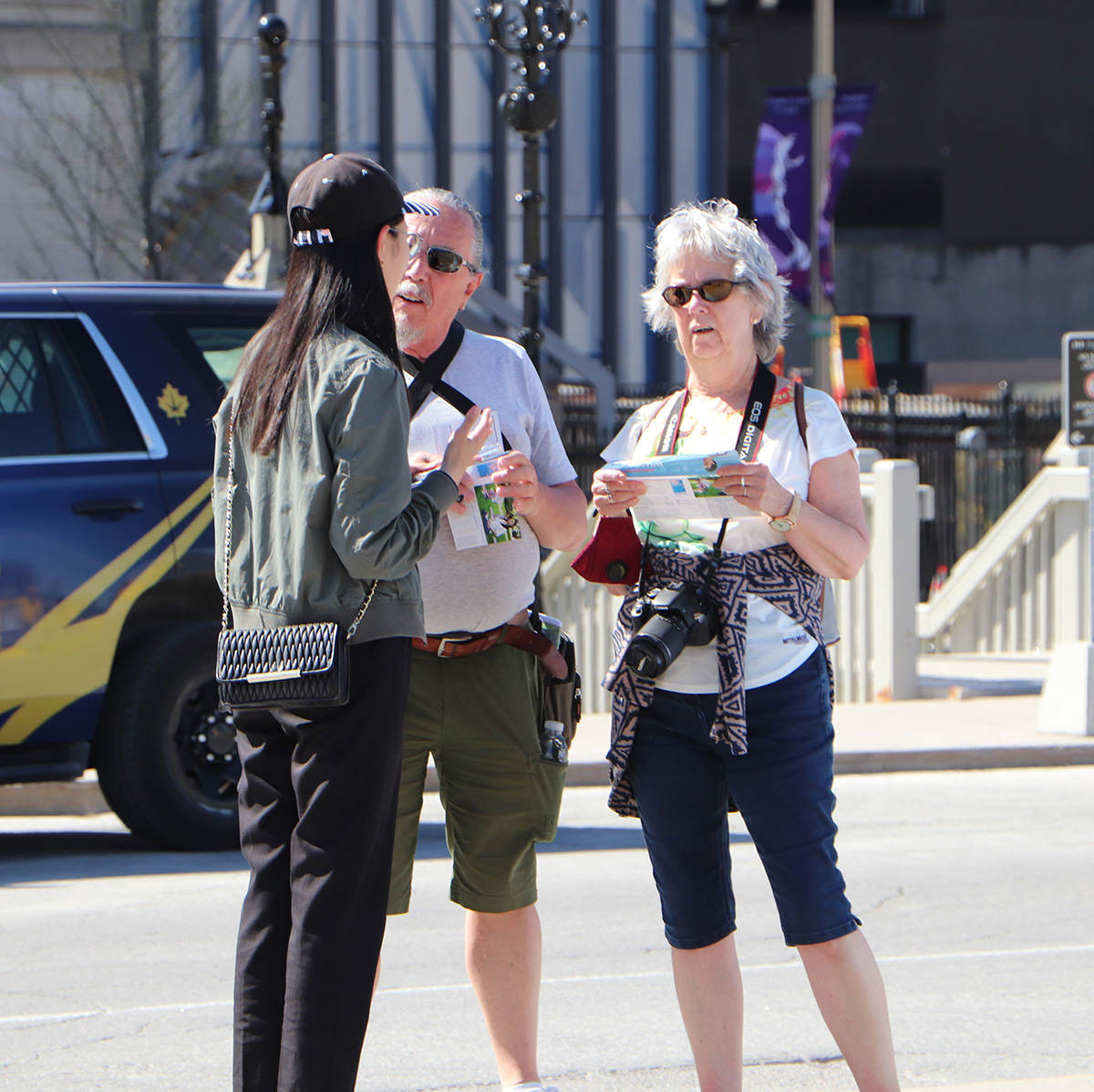 来自美国的夫妻雷吉(Reggi)和格拉迪斯(Gladys),他们是来到加拿大旅游,在看到大法弟子的游行时,他们不禁驻足观看,在大法弟子告诉他们今天是庆祝法轮大法洪传三十周年的游行时,他们都高兴地说:“我们这么荣幸!能在来到加拿大旅游的时候看到这么好的游行。”