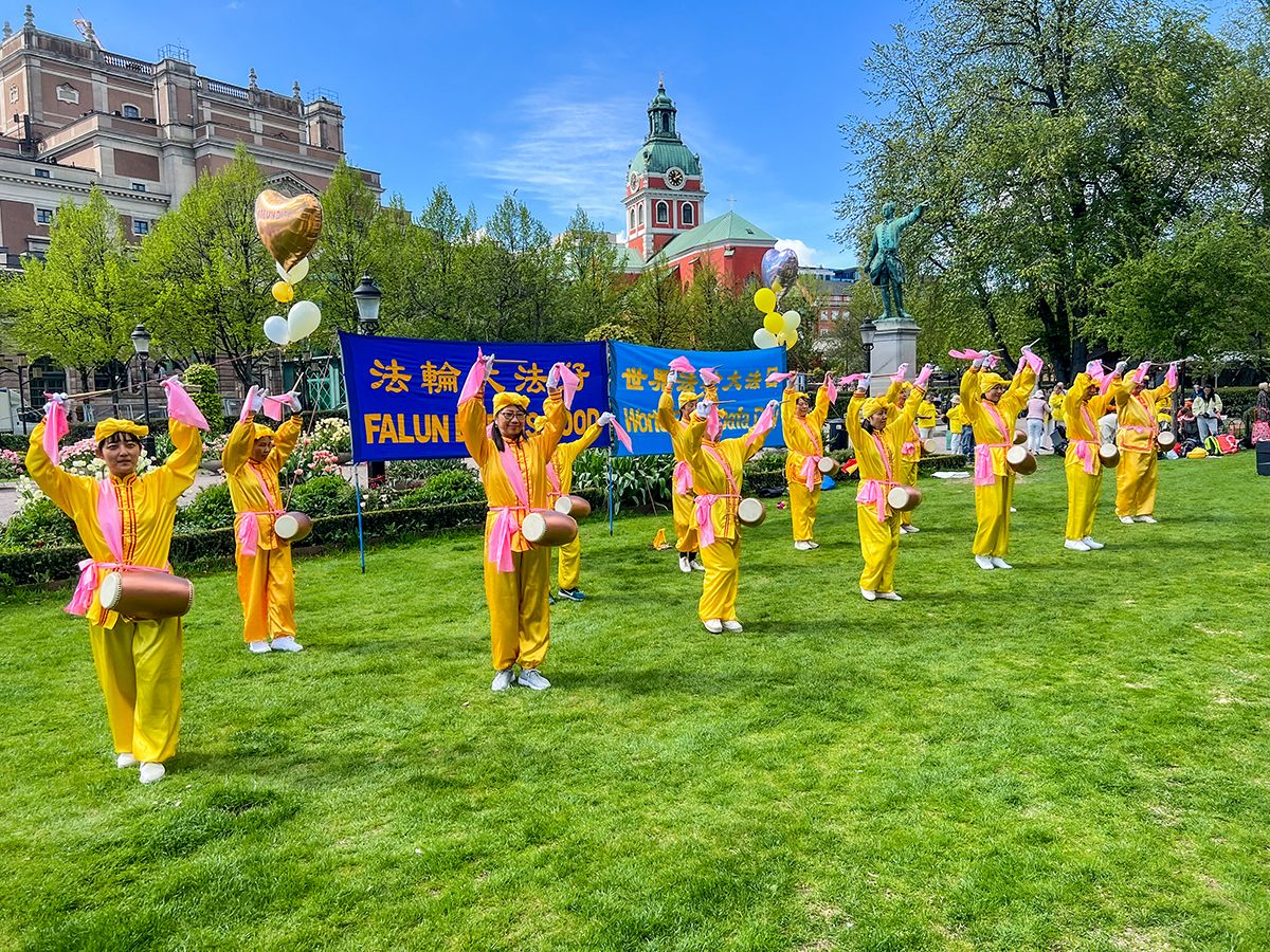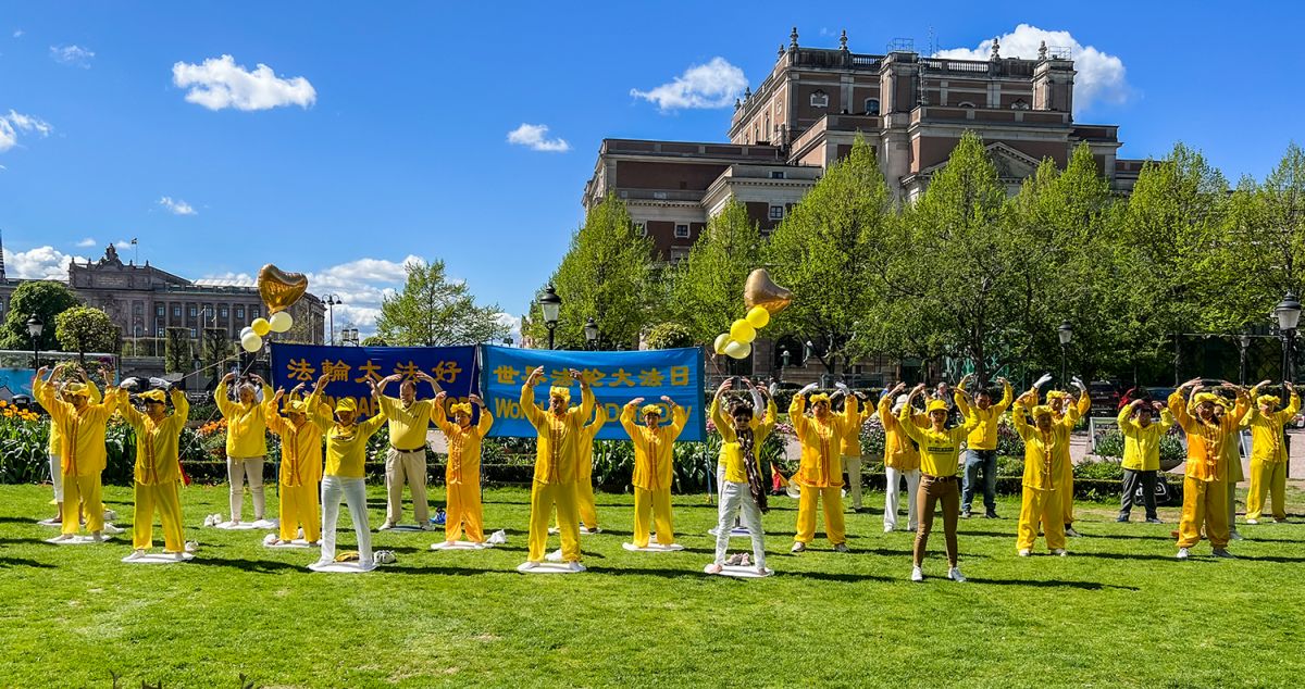 ![]() 图1:2022年5月13日、14日,法轮功学员在斯德哥尔摩皇家花园与民众共庆世界法轮大法日暨大法传世三十周年。学员们集体炼功,展示五套功法。 |
